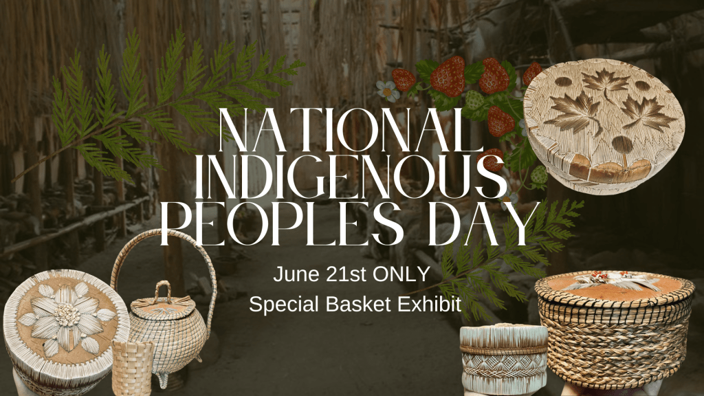 Join us on National Indigenous Peoples Day on June 21st by recognizing and celebrating the history and heritage, resiliency, and diversity of all First Nations, Inuit, and Métis across Canada. On this day we will be showcasing our beautiful collection of Traditional Baskets and unweaving the dark past of Traditional Basket Weaving and its truths by showing you our special collection of Traditional Baskets from across the homeland communities. This is a FREE day admission to educate the community.