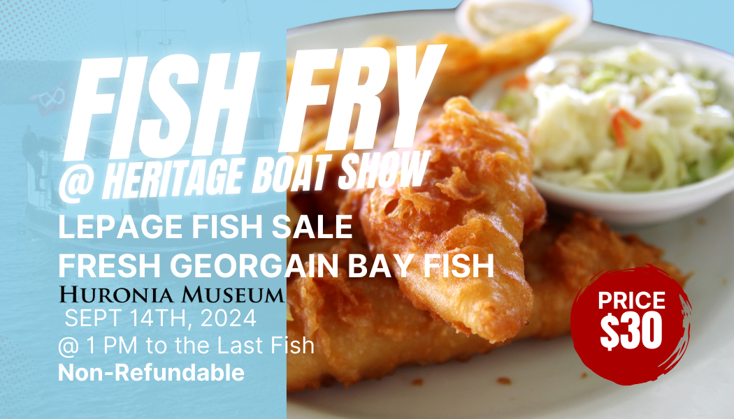 Tickets are $30 (tax included) for Two Pieces of Fresh Georgian Bay Fish, Fries, Coleslaw, and all your condiments! Secure your fresh fish plates today at Huronia Museum, open Mon-Sun from 9 am – 4:30 pm, or email transfer with your name and fish fry to huroniamuseumcash@gmail.com. All proceeds go back into Huronia Museum and Georgian Bay Heritage Boat Leagues historical preservation.