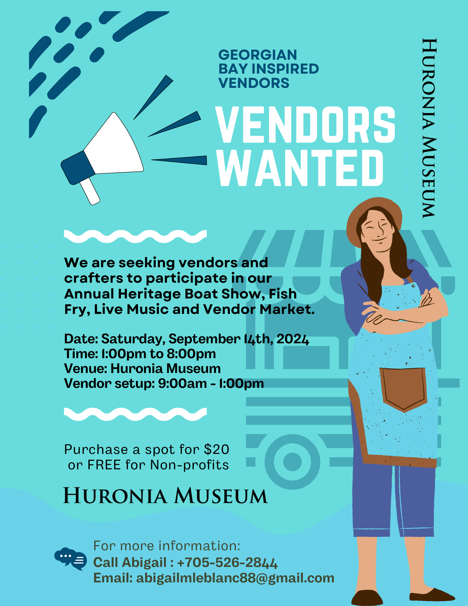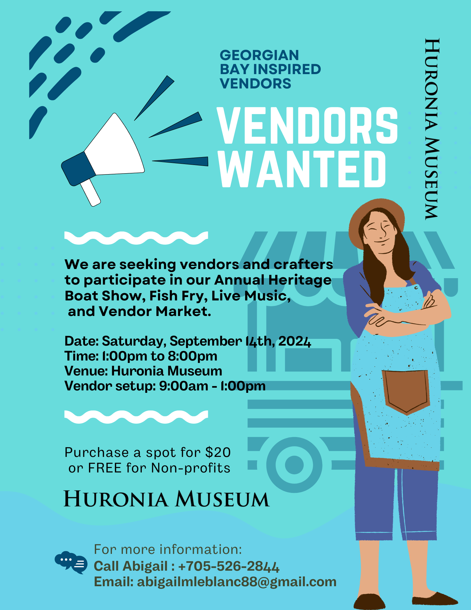 Join us as a vendor on September, Saturday 14th, 2024 by emailing abigailmleblanc88@gmail.com or call Huronia Museum, Abbie at 705- 526-2844.