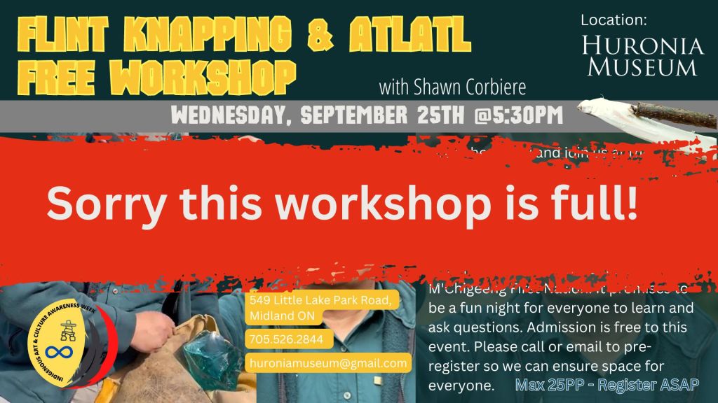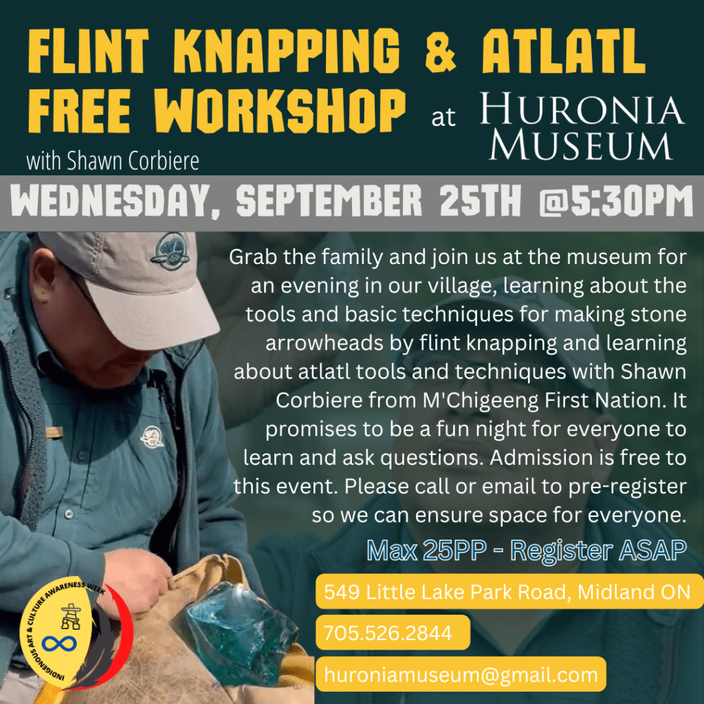 Bring the whole family to dive into the fascinating world of ancient tools and techniques. Shawn Corbiere from M’Chigeeng First Nation will guide us through the art of flint knapping, showing how to create stone arrowheads. Additionally, explore the history and use of the atlatl, a traditional tool for enhancing hunting.