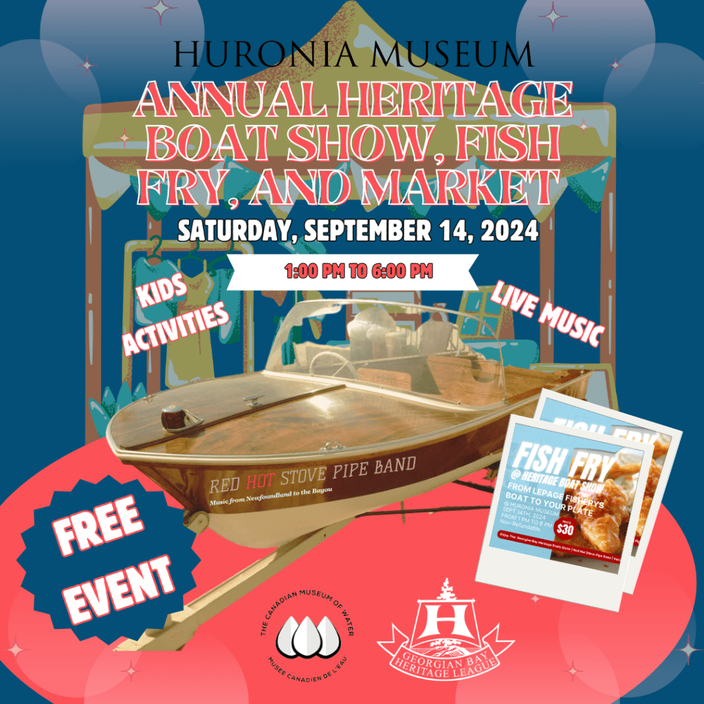 We would love to have you at our Annual Heritage Boat Show, Fish Fry, and Vendor Market with live music and games for the whole family to enjoy a day of fun in the sun with community; here at Huronia Museum with the Georgian Bay Heritage Boat League.