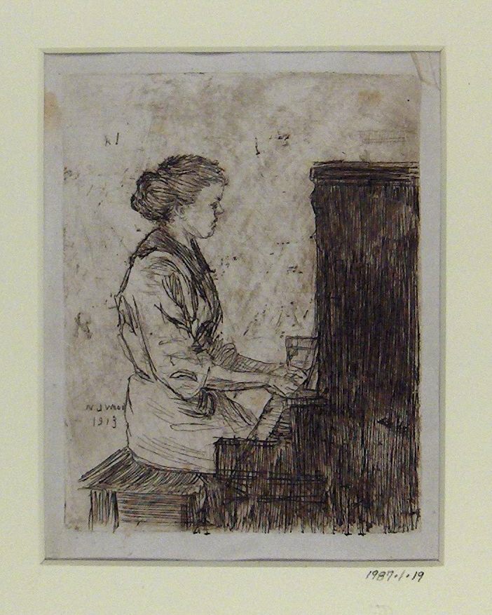1. This is an early work by Wood from 1913. The museum has over 50 etchings similar to this example on display in the Historical Art Gallery Room. In total, nearly 75 original works by Wood in gouache, watercolour, oil and etching. A display of Woods homemade etching tools and press is being considered.