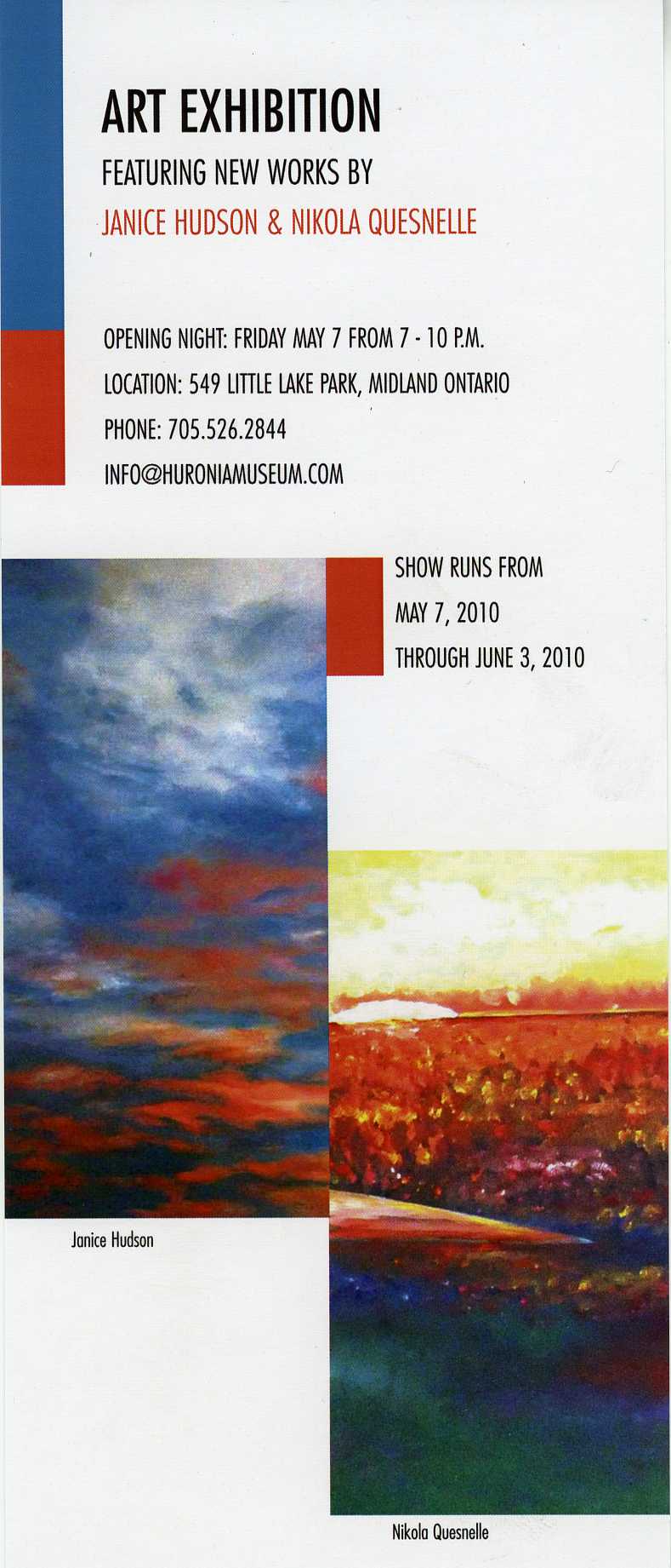 The art of Janice Hudson and Nikola Quesnelle are featured in an art exhibition at the Huronia Museum from Friday, May 7 to Thursday, June 3, 2010. To learn more about the exhibit, check out this article from the Midland Free Press.