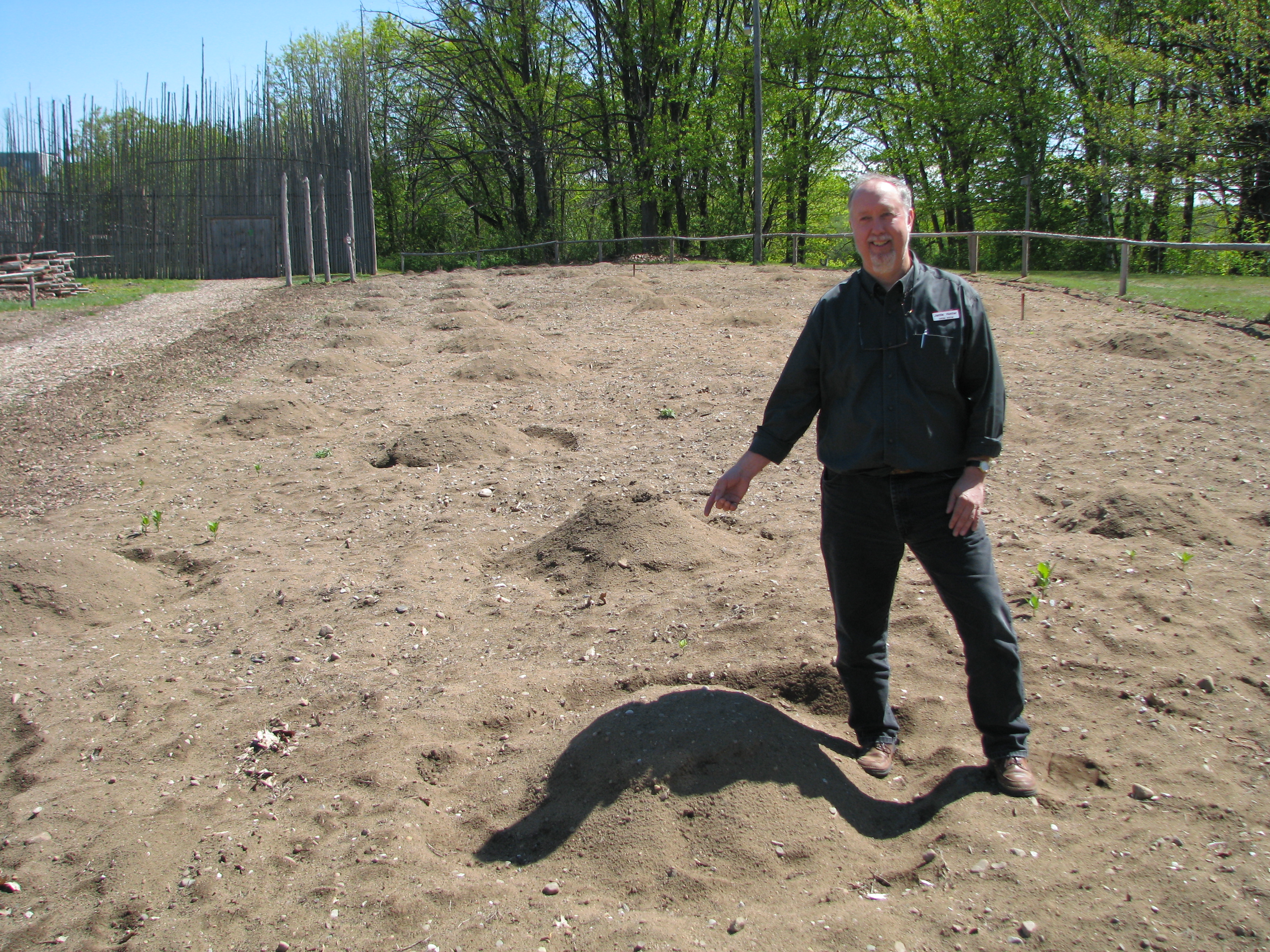Curator Jamie Hunter shows off the Huronia Museum's corn field, which has recently been planted and will begin to grow very soon. Stop by the museum all summer long (including weekends!) to see how tall it will grow!
