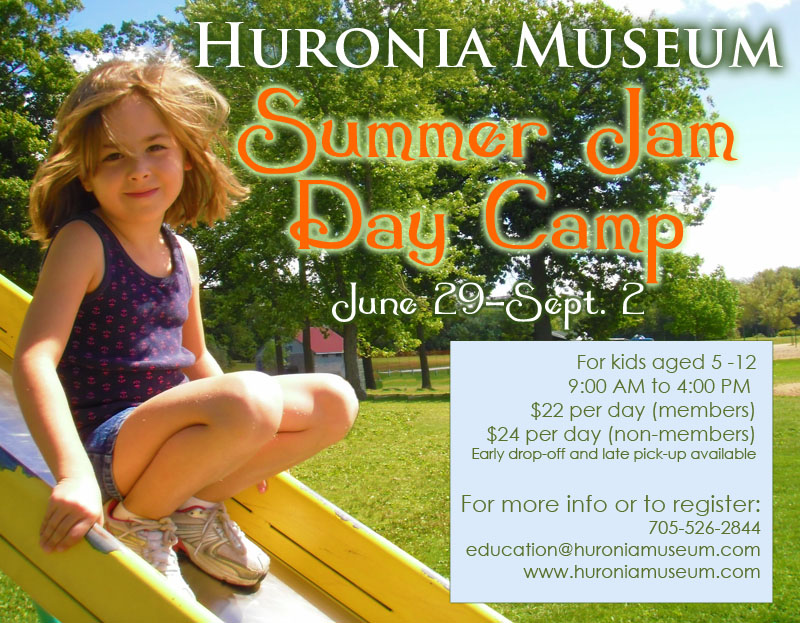 Summer Jam Day Camp runs from June 29 to September 2, 2011. It runs from 9:00 AM to 4:00 PM. Early drop-off and pick-up are available. The cost for Summer Jam is $22/day for Huronia Museum members, $24/day for non-members.