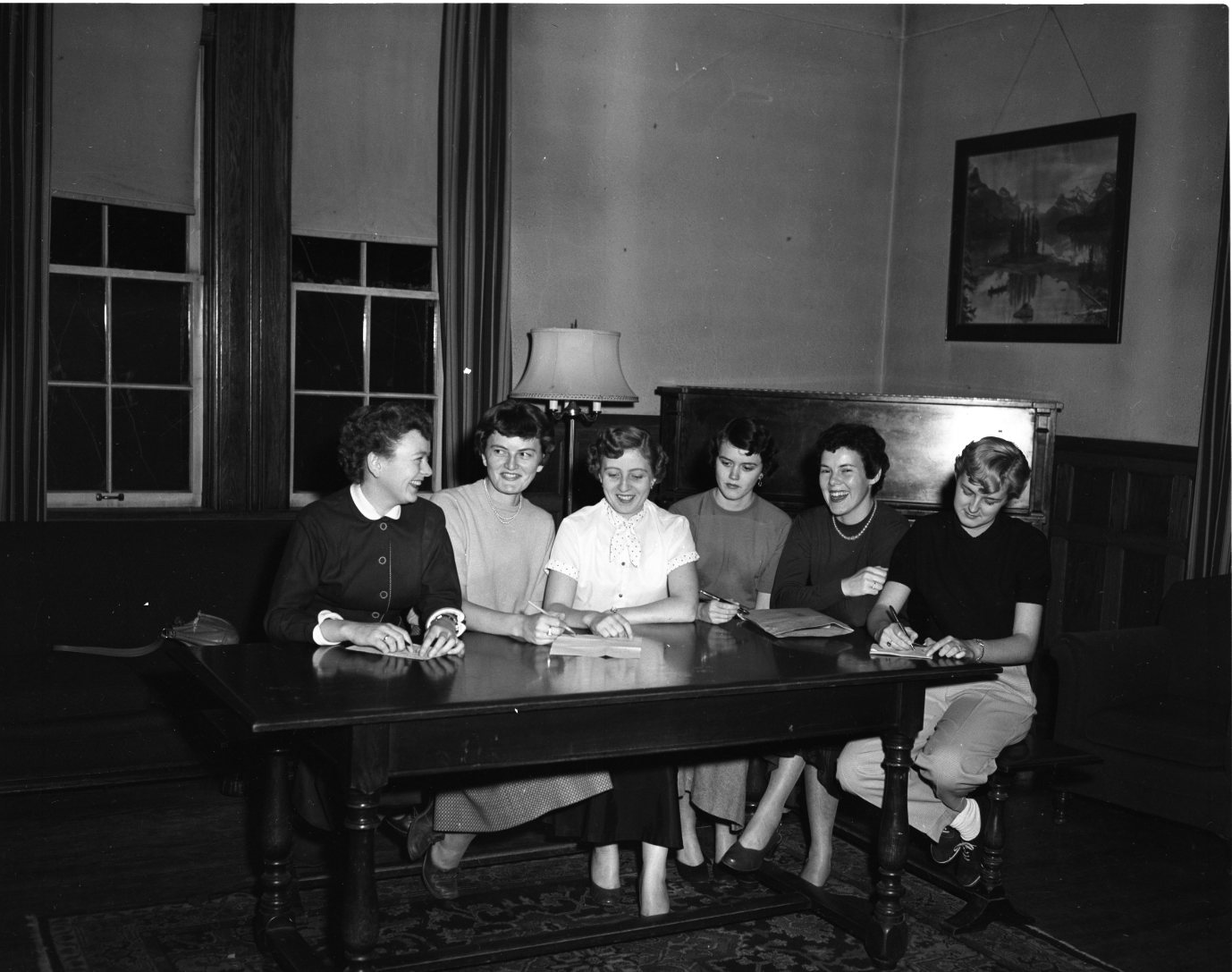 YMCA annual fundraising campaign starts Monday, goal $8,000.00. Phiat Club members, formerly the High-Y Grads Club plan their part of the drive. L to R, Grace Edgar, Helen Laidlaw, Mrs. Ross Thompson (Doreen), Mary Arbour, Elaine Gerow and Eleanor Chornoboy