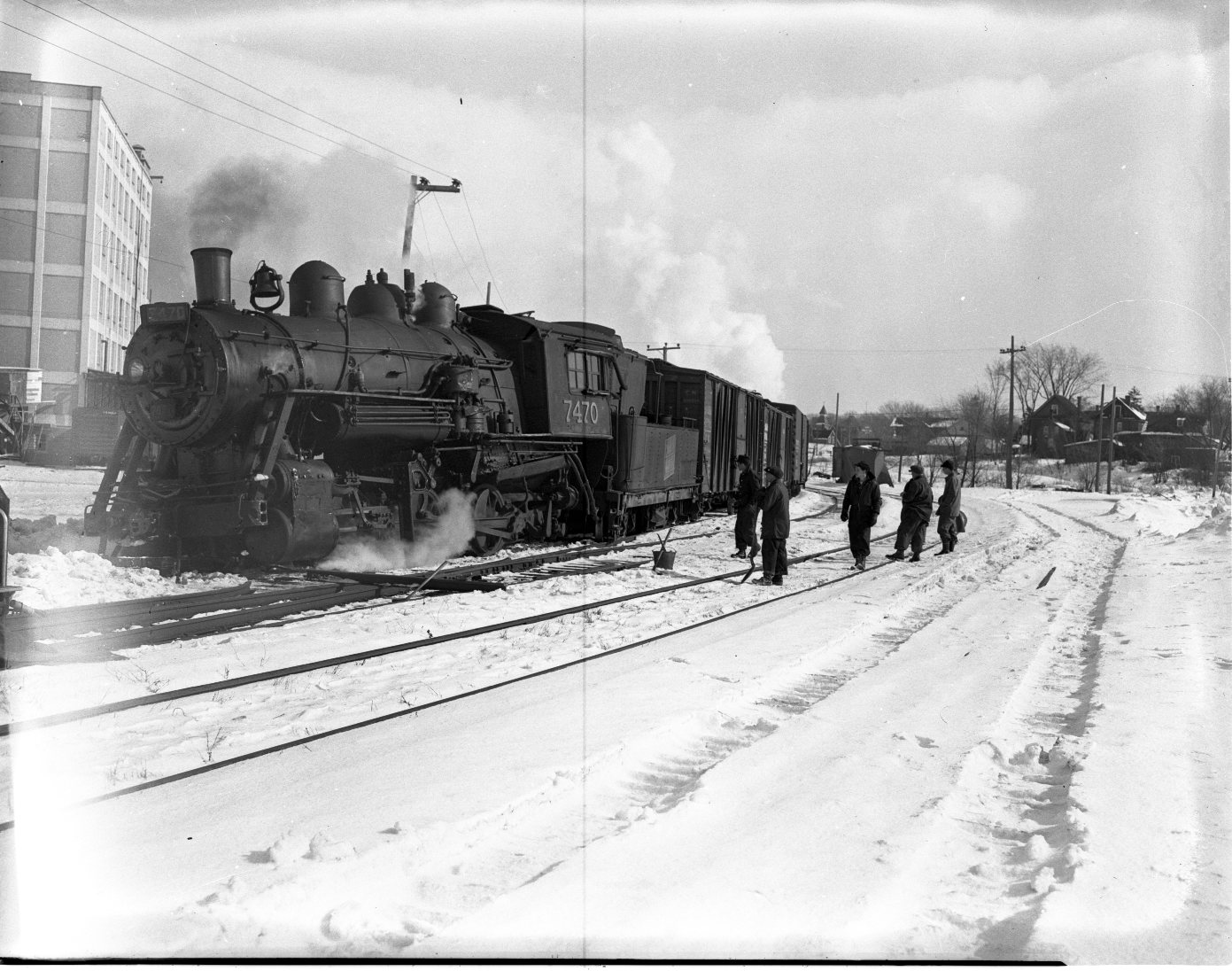 CNR 7470 lays helpless behind the CSL elevator while local efforts to right her have failed and a crane will be brought in from Allandale. This locomotive was built for the Grand Trunk Railway in 1921 by the Canadian Locomotive Company as their 1795. It is an 0-6-0 type which is intended for heavy switching assignments such as moving long cuts of heavily laden grain cars. The unit still exists (2015) in working order as an excursion engine at the Conway Scenic Railroad at North Conway, New Hampshire. Follow the link to see her operating in 2015.