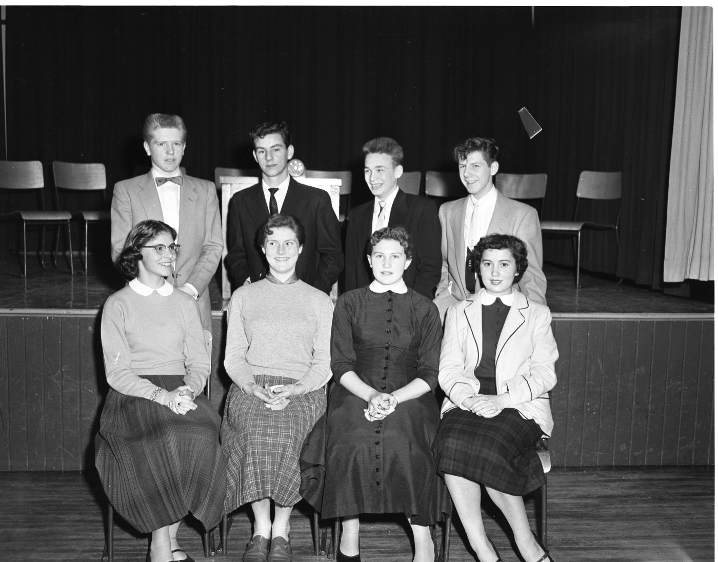 Contestants in the Midland Lion’s Club senior oratorical contest after delivering their prepared and impromptu addresses in the Midland District High School auditorium. Barbara Johnston, Martine Gouett, Barbara Leclair and Margaret Lavigne. Back row, Dean Nicholls, Ken Grant, Wayne Parker and Guy Johnstone. Martine Gouett and Ken Grant were the winners.