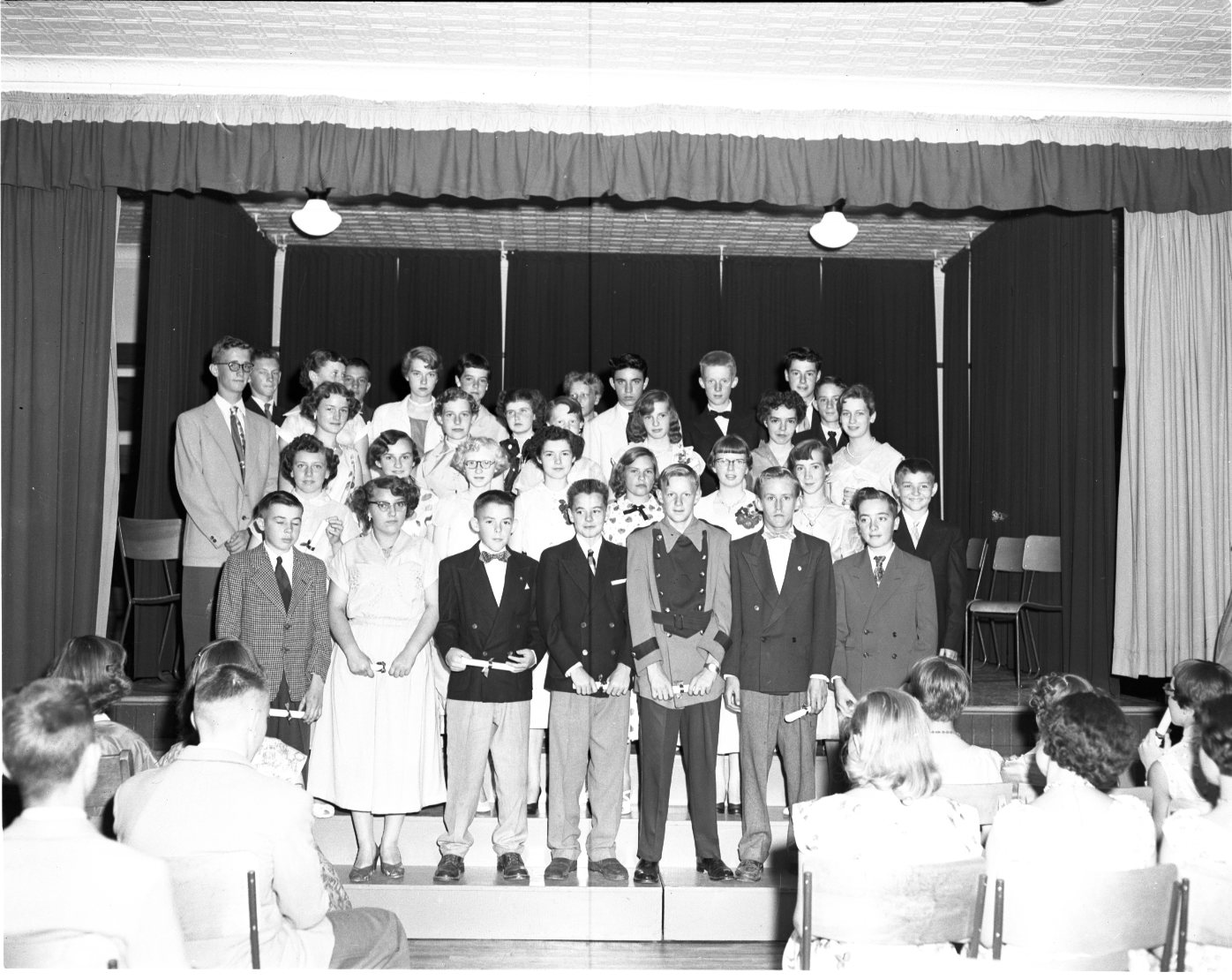 On the stage of the Midland High School auditorium is this group of graduates from Sixth Street School Midland. They are from the grade eight class taught by James Robinson and are being honoured by the Midland Home & School Association.