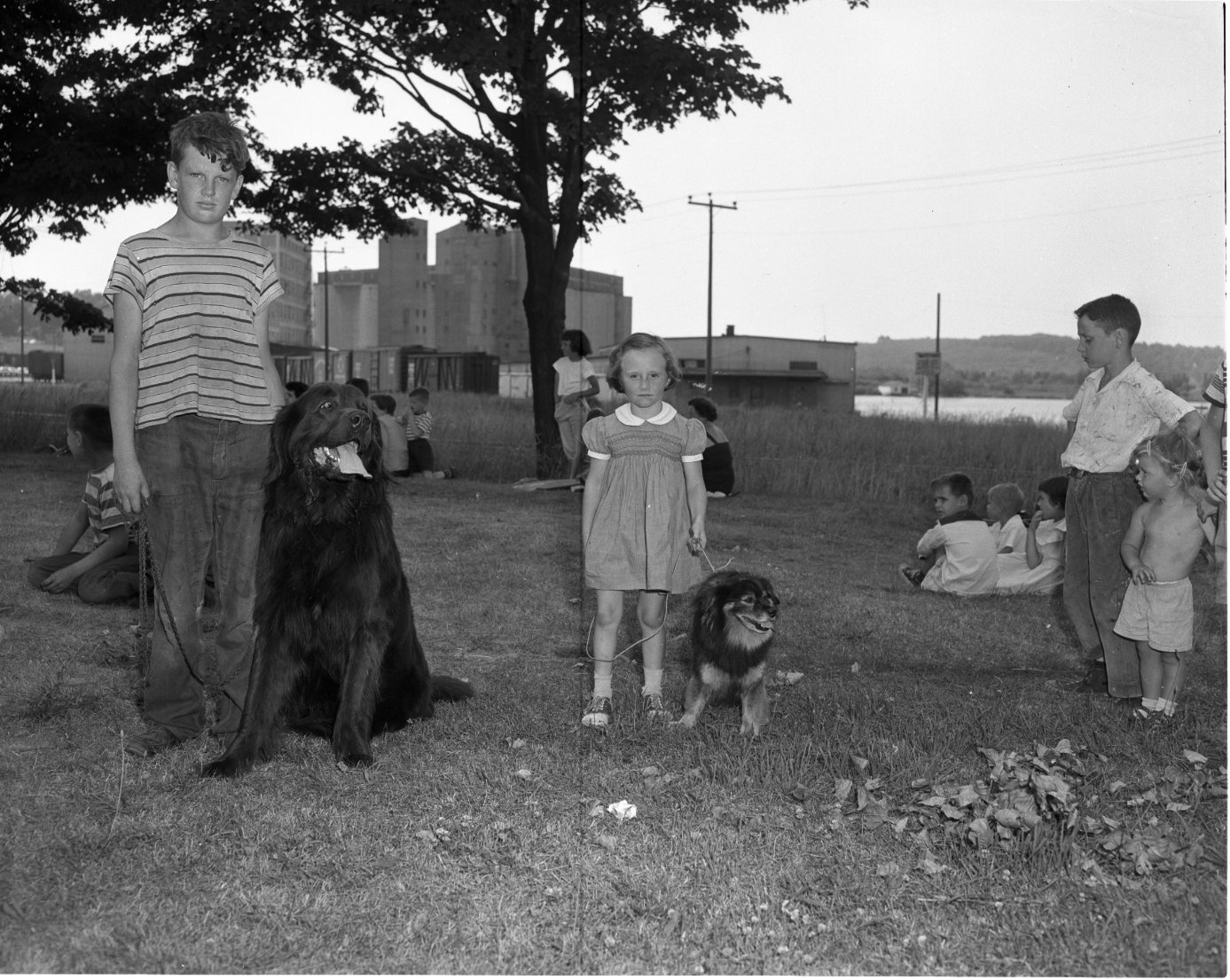Young girls getting a bit of swimming practice under the watchful eye of Judy DeNure and Jacqueline Palmer, assistant playground supervisors. This is part of the daily summer program at Little Lake Park and is their water safety training.