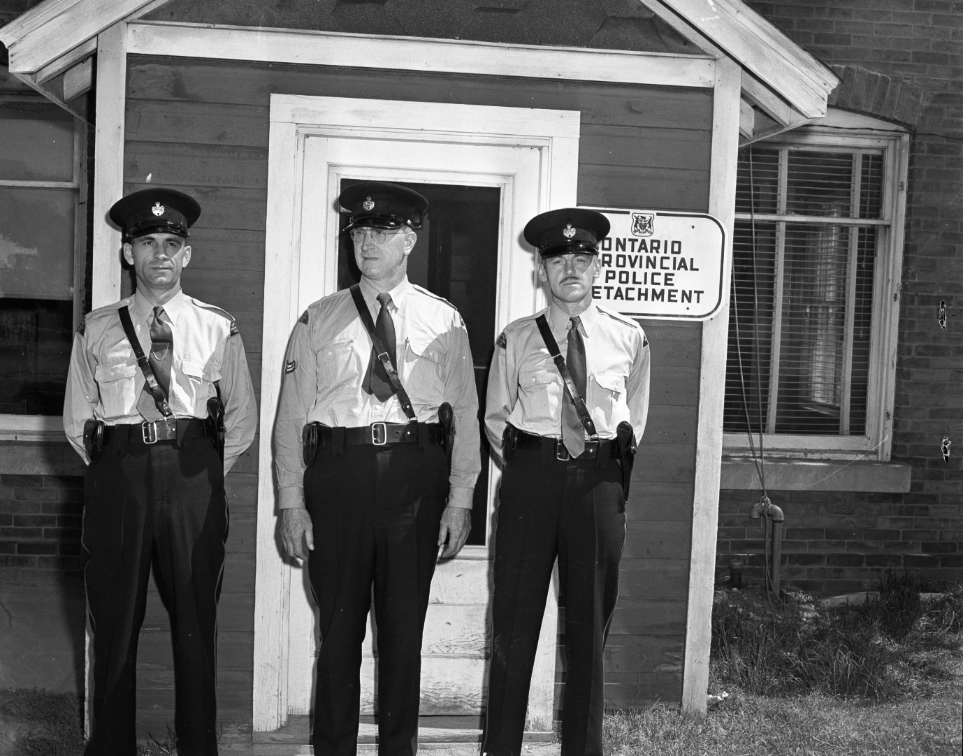 This photo was not used in the newspaper but the individual officers were pictured. Charles Beeman of Midland on the right, whose resignation from the OPP was effective August 15th, 1955, a member of that force for 8 1/2 years. Constable Bert Banting, left and Cpl. Blake Ball, center, all three Provincial Police officers are from the Victoria Harbour office.