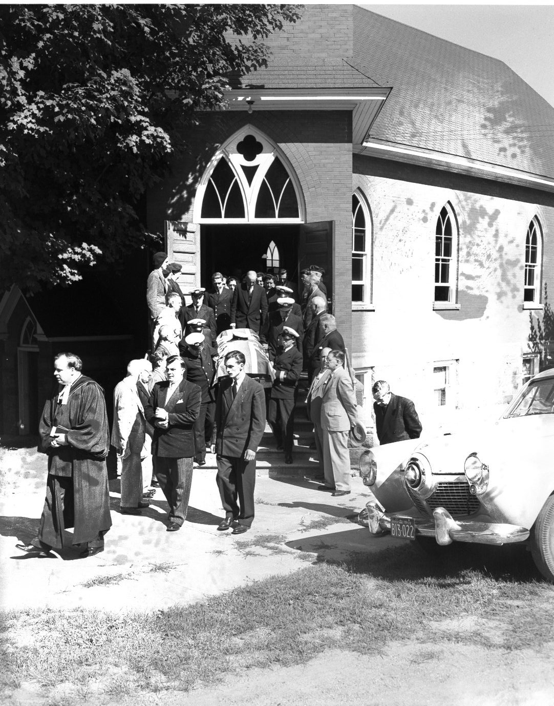 Preceded by Rev. Charles Carter the flag draped coffin of Capt. Robert Mitchell is borne from Bonar Presbyterian Church by officers of the Keewatin which the veteran mariner captained on his retirement in 1954. Six Legion members form an honour guard down the steps.