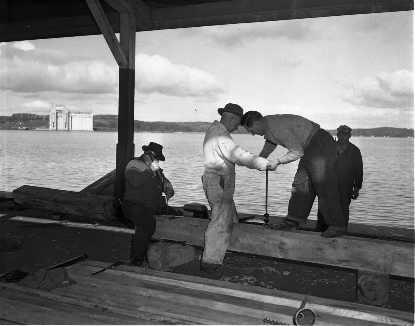 Boring three inch holes in 10″ by 10″ Elm beams is Dick Moore center and Jim O’Hearn on the right. Bob Wilson, foreman, is on the left. Ninety four timbers are needed to go around the government dock at the bottom of King Street, sixty are 10 feet long the rest are 12 feet long. Timbers are being installed near the water line on the side of the dock to act as rub rails or bumpers.