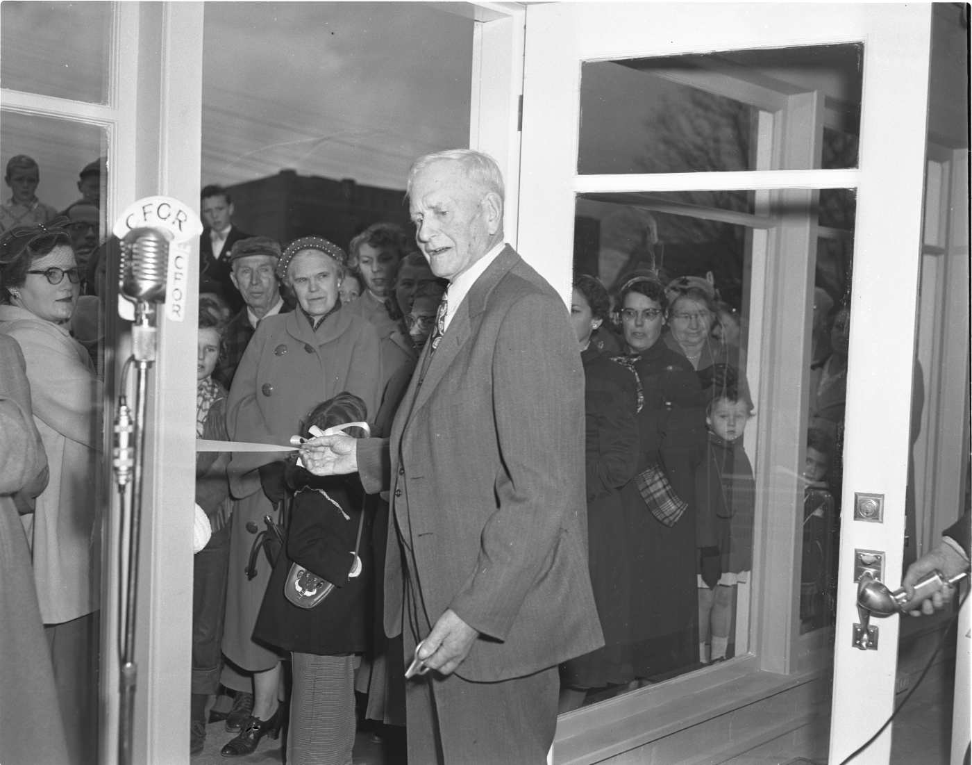 Moonstones oldest resident, Robert Cumming, 82, is seen cutting the ribbon to open the new Dunlops Furniture and Appliance store. Mr. Cummings gave Mr. & Mrs. Lloyd Dunlop the keys to his own home last November 7th when their home and store was destroyed by fire. A retired carpenter Mr. Cumming had hung the doors when the original store was remodelled in 1937 and again on this new building.