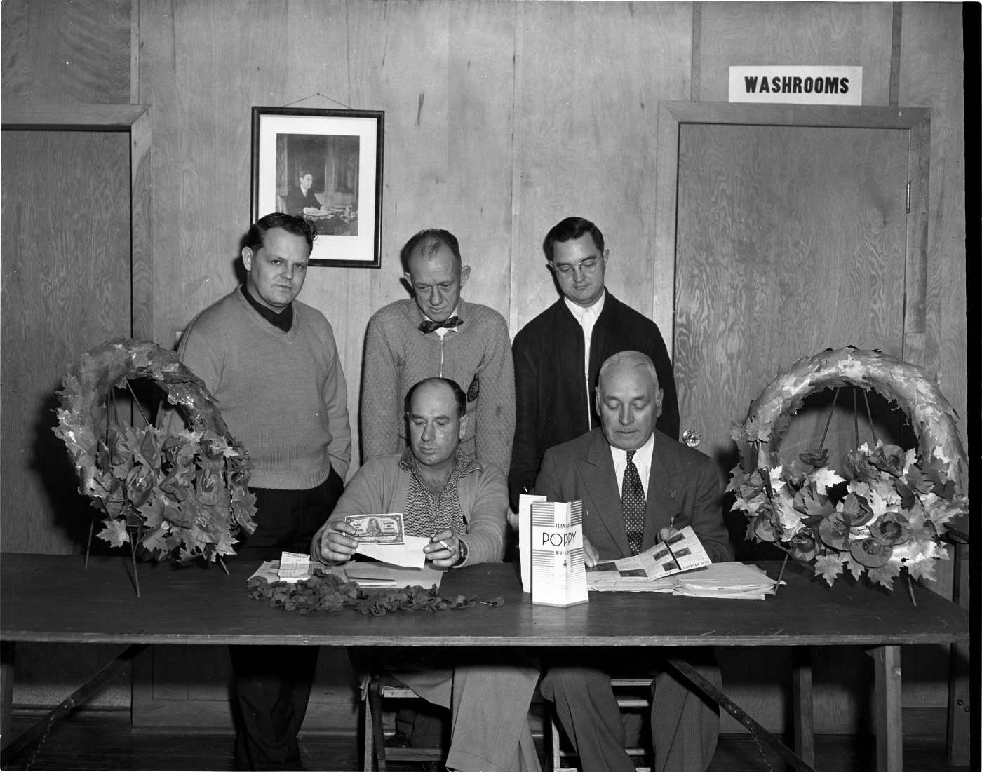 Branch 80, Royal Canadian Legion, Midland members prepare for Poppy Day, seated Gordon Burtch chairman, Len Wiles; standing, George Magloughlin, Alf Scott and Doug Blake.