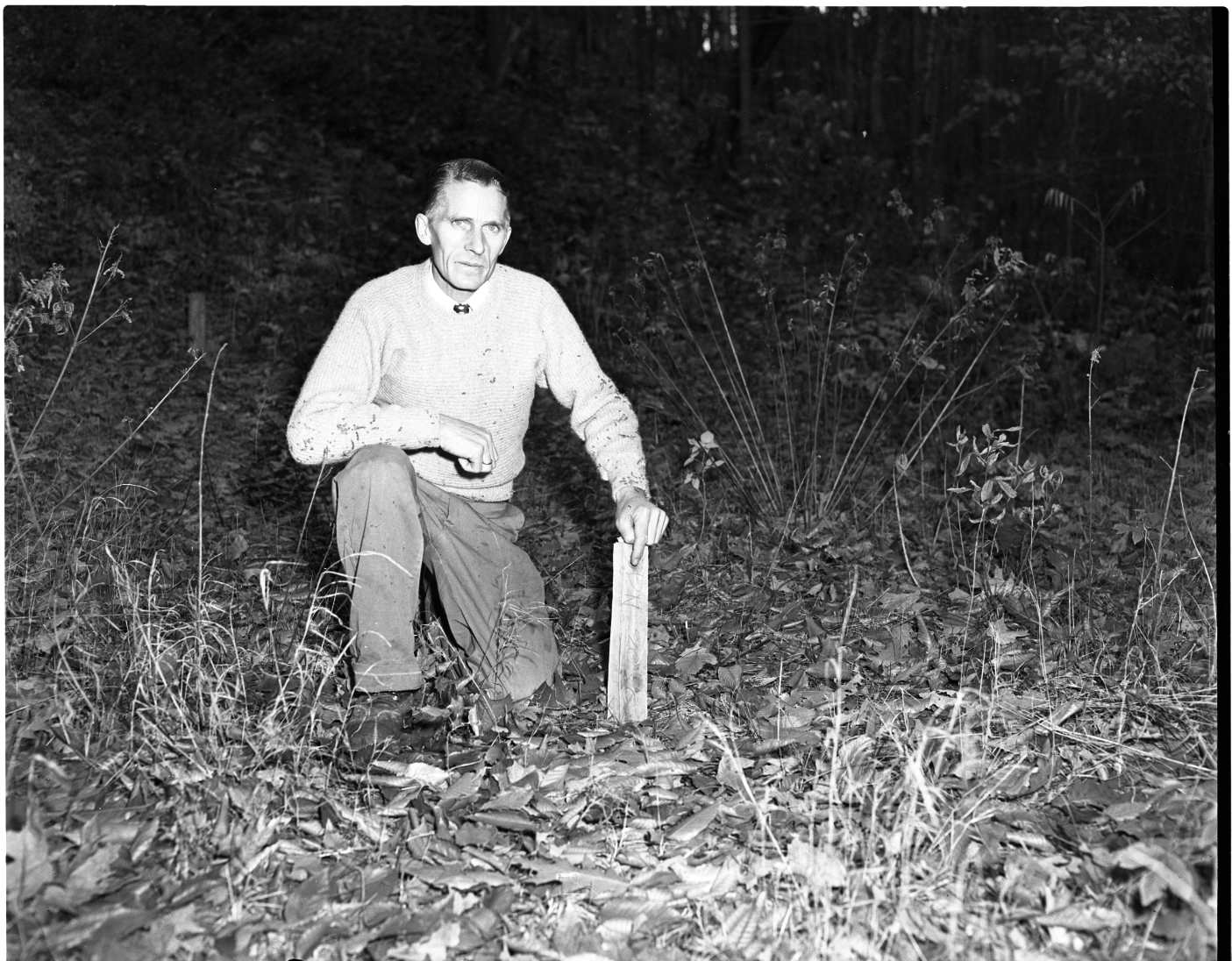 Pete Pettersen marks the spot where 20 feet of dirt has to be removed to achieve the proper slope for 180 foot jumps from the new 107 foot high ski jump, the old jump is to be torn down. The Dominion Senior Jumping Championship is to be held here on February 12th, 1956.