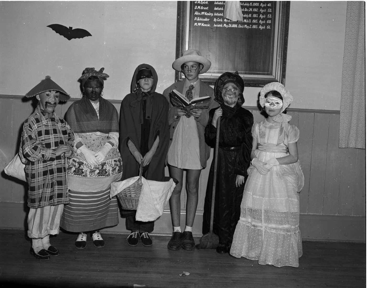 IODE hall in Waubaushene, members of the East Simcoe Brownie Troop are dressed up for Halloween, Lorie Wilson and Jacqueline Sauroiol of Waubaushene; Betty Hawke, Elizabeth Hall and Barbara Hawke of Coldwater; Dawn Lackie of Jarrat.