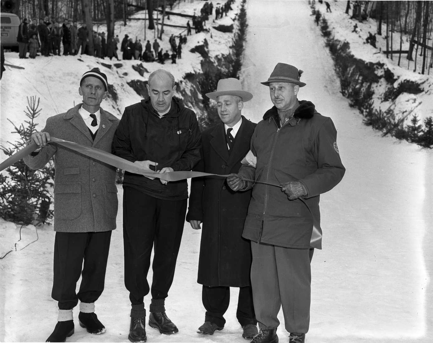 Long identified with skiing in Midland, William A. Robinson, MP for Simcoe East, cuts the ribbon to officially open the new sixty meter ski jump at Midland Resorts Ltd. during the provincial meet Sunday. Mr. Robinson was also the first president of the organization. Photo includes Pete Pettersen, manager of the resort, Mr. Robinson, Mayor Charles Parker and Ross Larway, Toronto, ski zone official.