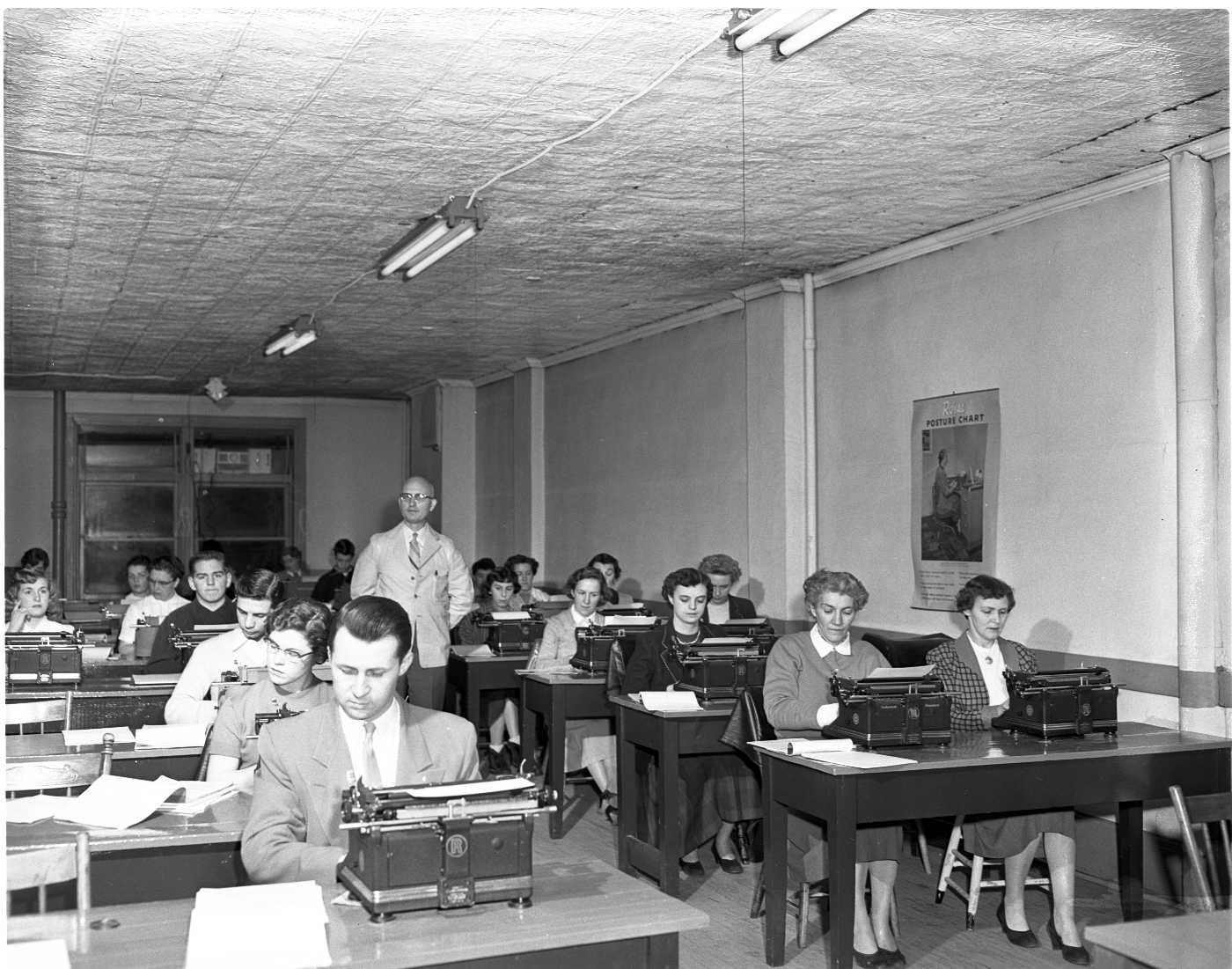 Midland Business College, the Tuesday, Wednesday, and Thursday night classes now have an enrollment of 49 students. The classes in typewriting and accounting have proved popular with adult residents of North Simcoe. Head of the business college is Norman Schell who is seen standing in these two photos.