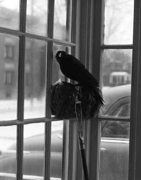 A crow is perched on a mop in the porch of Mr. & Mrs. Clare Marcellus of 183 Elizabeth St. (now 449). When released he headed home to the residence of Mr. & Mrs. Norman Reynolds, 168 Lindsay Street (now 176) where he is the pet of their son Frank Reynolds. “Tommy” was picked up as fledgling last year at Cedar Point and is a common sight around Regent School. He prefers to be indoors during the cold weather.
