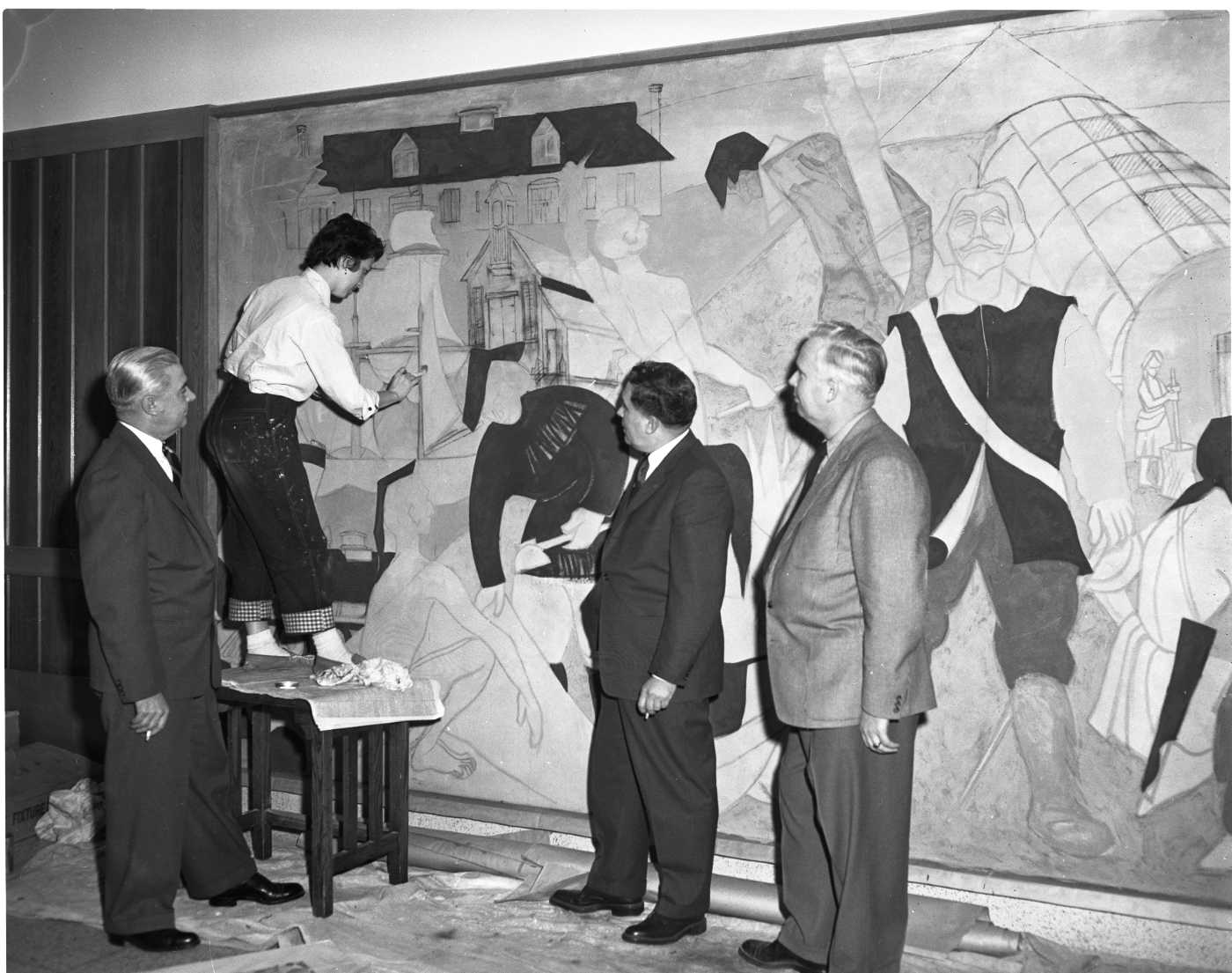 Jane E. Birchall nee Lippert, a young Toronto artist, works on the huge mural that will decorate the main hallway of the new Midland Penetanguishene District High School in Tay Township. School board members Tom M. McCullough, chairman Clarke Edwards and Karl Bertrand look on.