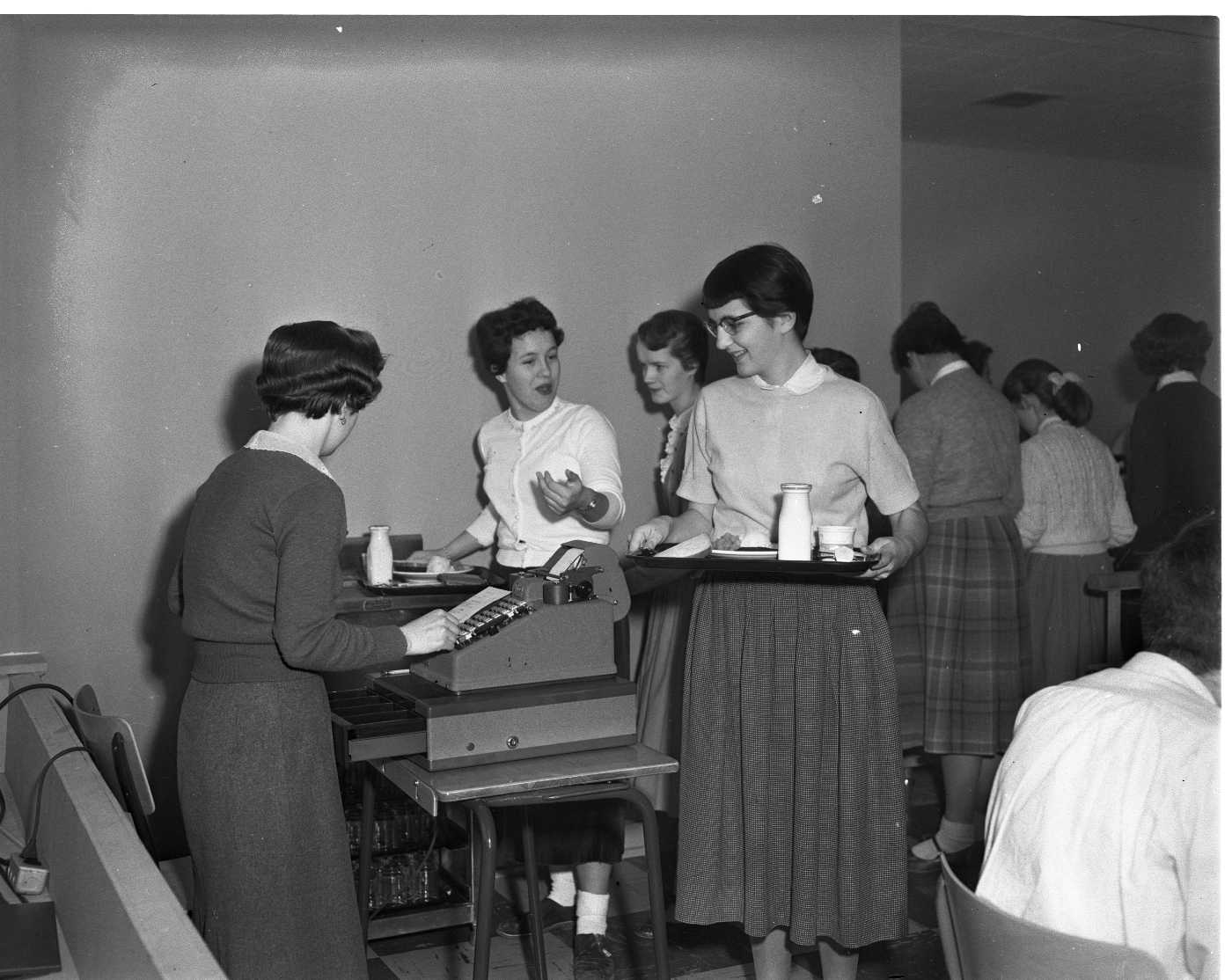Pupils of MPDHS were served their first hot meals from the kitchen of the new school Monday at noon. Barbara Piitz of Penetang, on the right, seems pleased with her meal of cube steak, potatoes, carrots, milk and ice cream. Mrs. Bryan Jones, the cashier, totalled the check up to 40 cents. Standard dinner is 25 cents, milk and desserts are extra.