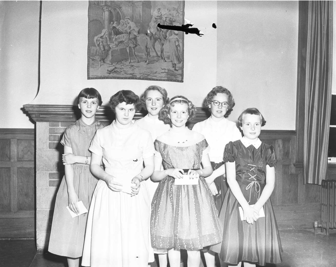 Six of eighteen scholarship winners in the Midland Music Festival are pictured in front of the fireplace at the YMCA on Hugel Ave. Back row, Ellen Barber, Arlene Armstrong, Sharon Robillard. Front row, Lois Cowan, Wendy Feltham, Penny Lapere.