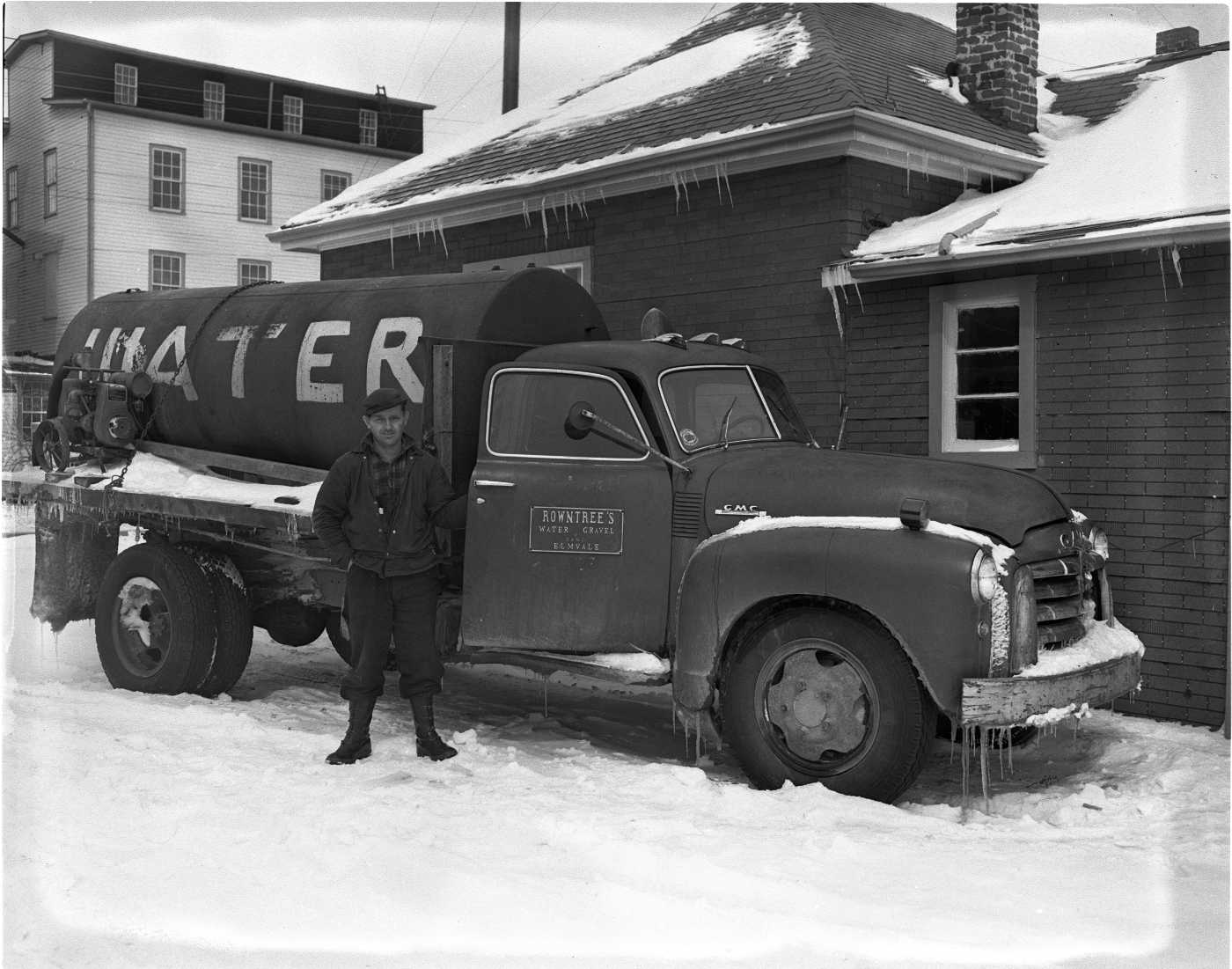 North Simcoe farms that depend on cisterns have had to rely on Earl Rowntree of Elmvale and his water truck as the long cold winter with no thaws has affected water supplies. With this 1,100 gallon tank Mr. Rowntree ranges from Midland to Stayner serving over fifty customers. Copeland flour mill Elmvale in the background.