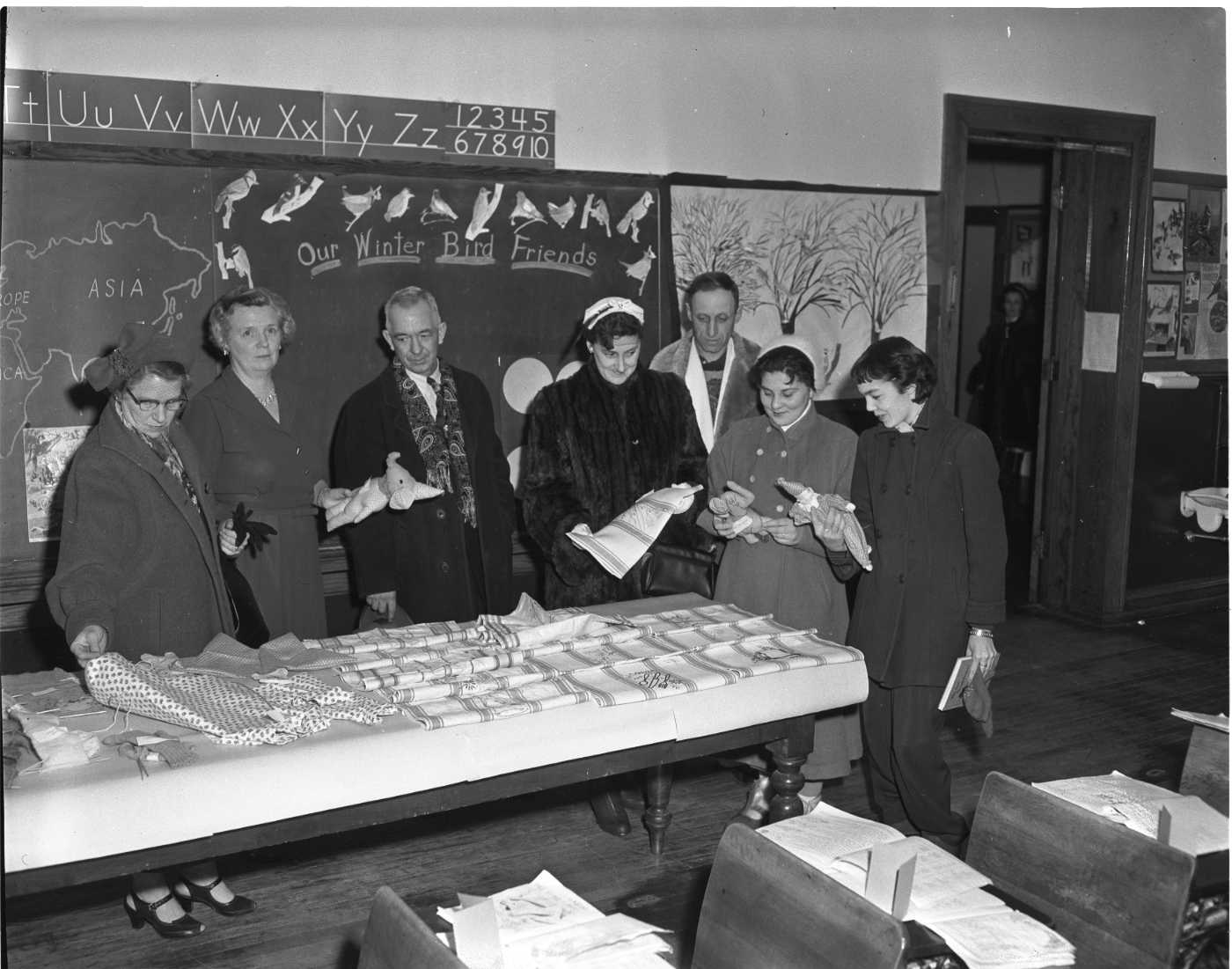 Auxiliary class work for girls at Sixth Street School attracted a lot of attention at the annual open house on March 8th. Second from left is teacher Miss Frances Kerr who shows samples of dish towels, dresses and cloth toys the students have made.
