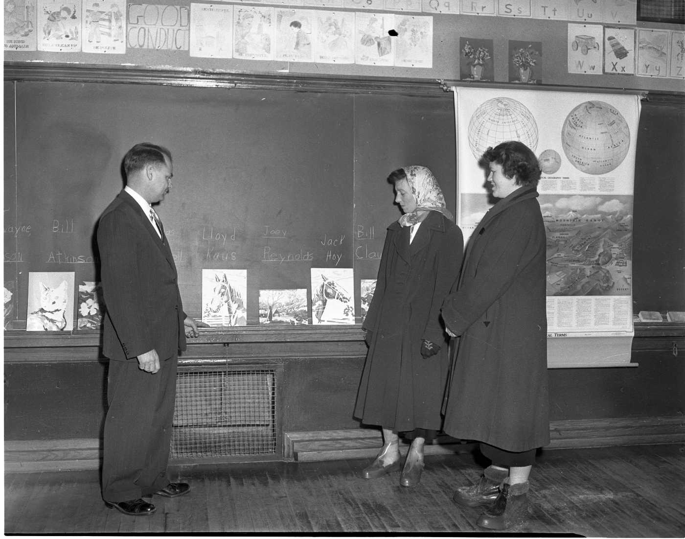 Principal of Sixth Street Public School, Ken Cowan shows Mrs. Fred Hoy and Mrs. Bert Kaus their sons school work. Open house is observed in all Midland public and separate schools as part of education week.