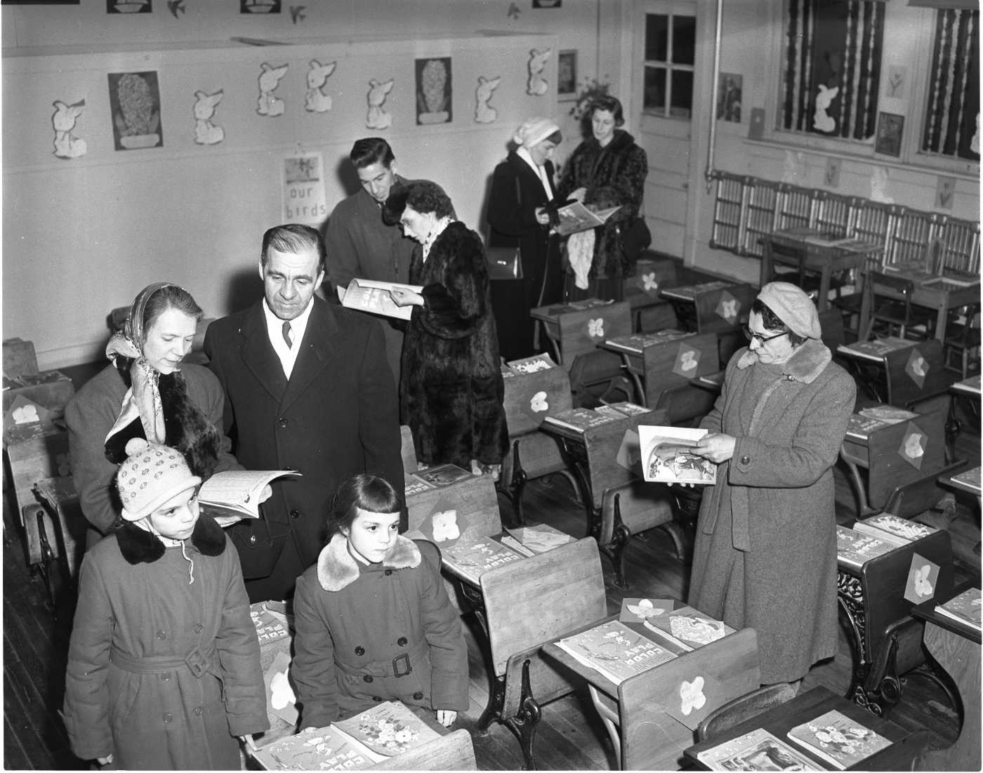 Parent teacher night at Sacred Heart Separate School on March 8th. Looking over papers in the Grade 1 room are parents Mr. & Mrs. Arthur Montgrain, 108 Gloucester Street (now 300 Gloucester Street) and daughters Mary Lou, 6, and Carol a grade 3 pupil.