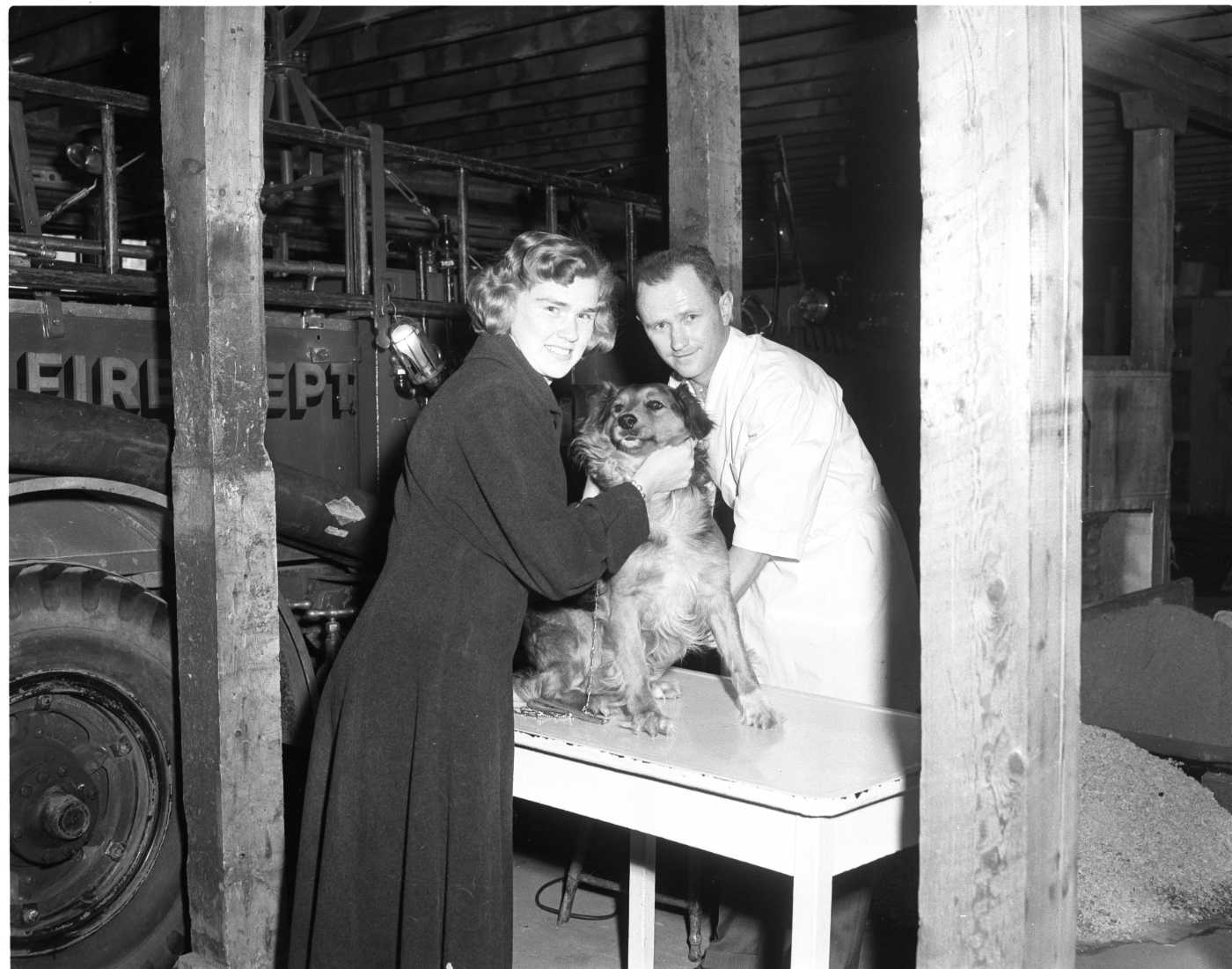 Dr. J. W. Windrem, an Elmvale veterinary surgeon, administers rabies vaccine to Bo-Bo the pet of Miss Joanne Wadge of Midland. A rabies inoculation clinic was held at the Midland police department Saturday afternoon. Everyone looks happy except Bo-Bo.