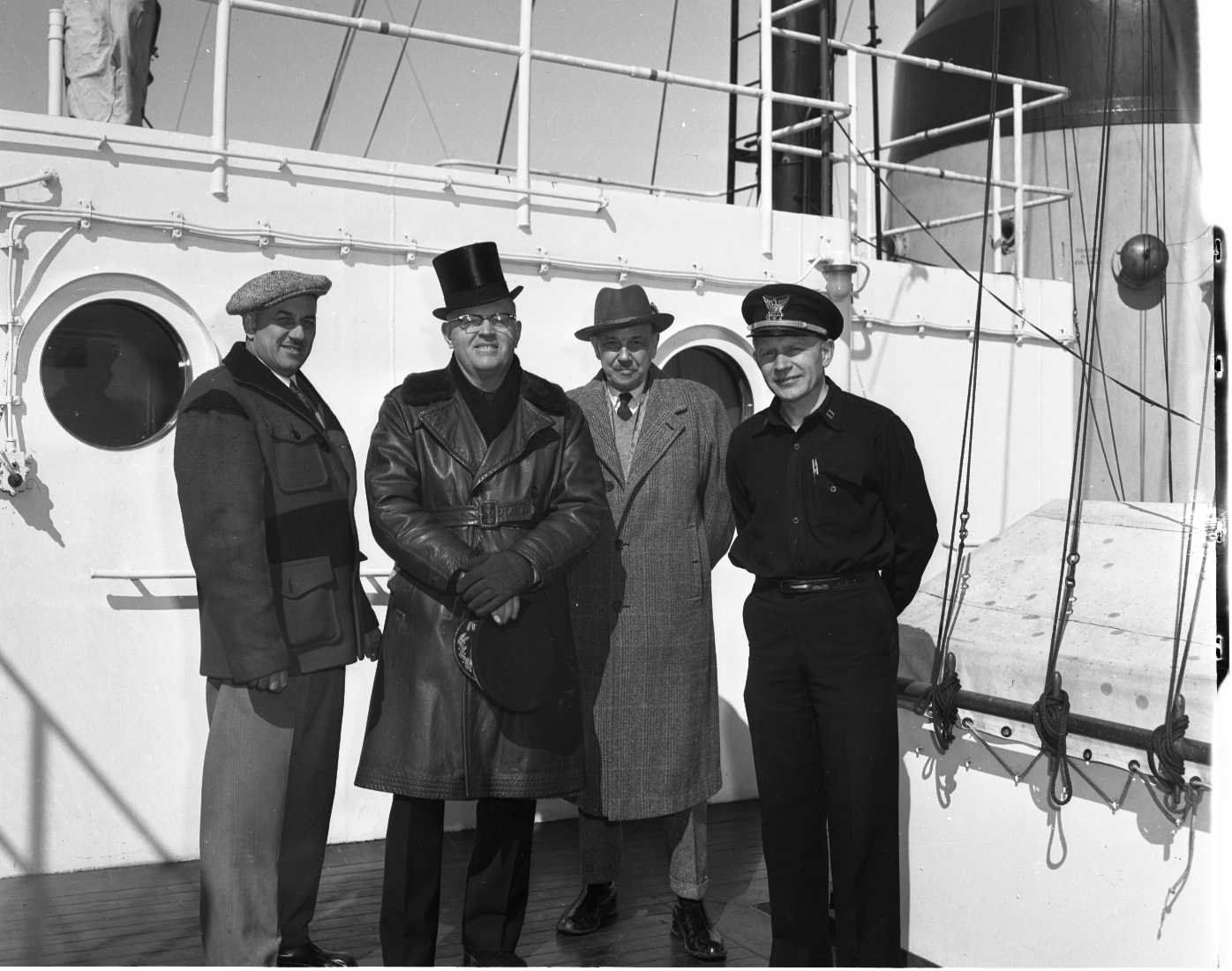 New record set for the opening of navigation in Midland when the American ice breaker USCG Mackinaw arrived on March 18. This beat the previous record set in 1953 by ten days. The traditional “topper’ party included Alderman Clint Smith, Capt. Clifford MacLean, Major A. C. McCaul of the Chamber of Commerce and William Ball chief engineer of the Mackinaw. The powerful icebreaker made quick work of the two foot thick ice in Midland and Port McNicoll harbours.