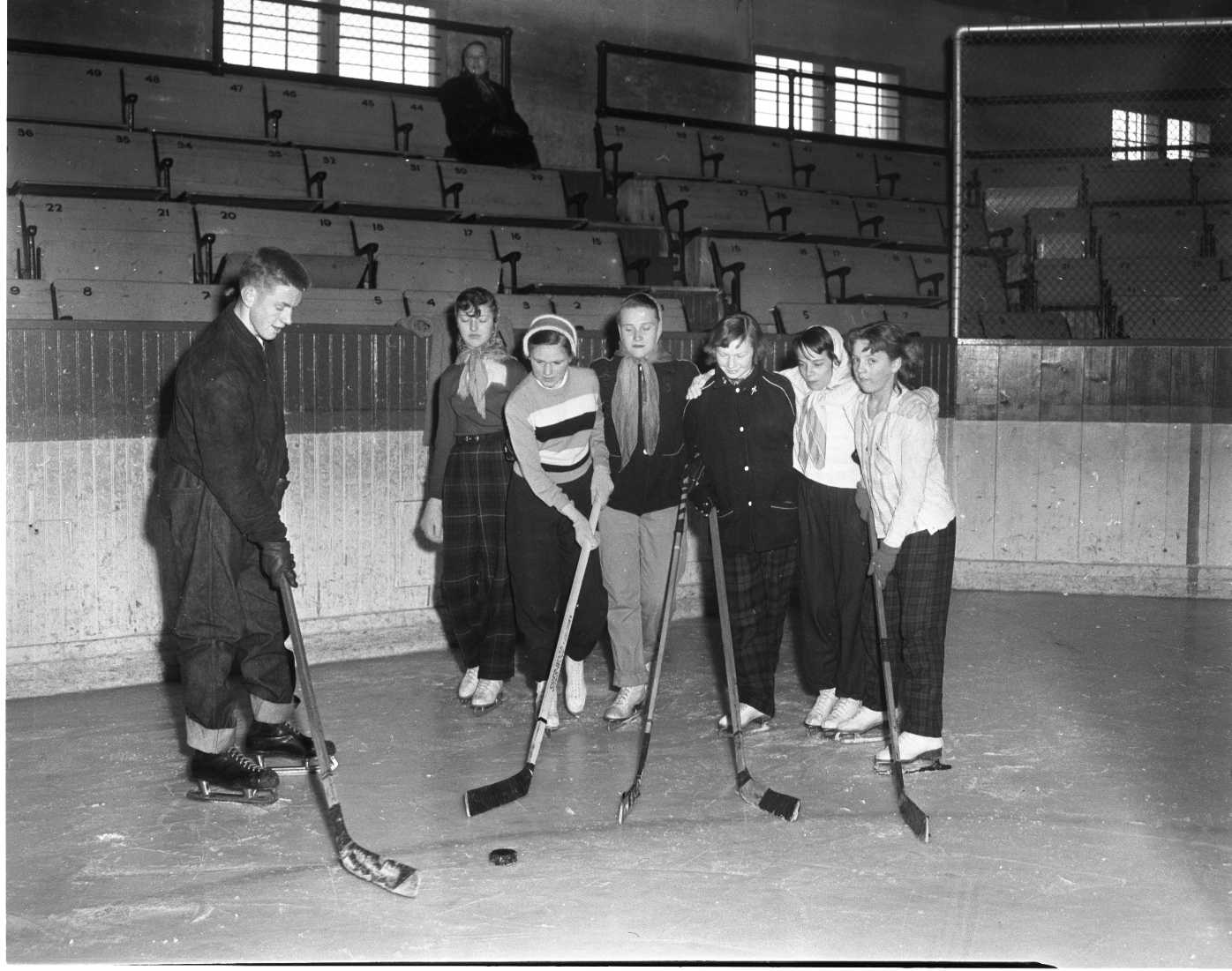 Midland Public Schools final hockey matches, including games between the girls of the west side representing Parkview and Sixth Street schools and Regent School representing the east. Don Wilcox is seen giving some of the west side girls some pointers; Carolyn Blythe, Betty Jean Watkinson, June Elliot, Joy Lowes, Patsy O’Hara and Shannon Bazinet.