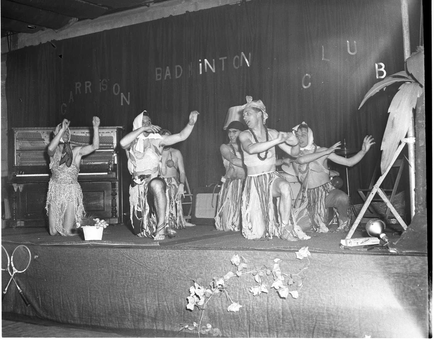 Imported direct from Hawaii, Hula girls entertain at the annual Midland Garrison Badminton Club party Friday night. A closer inspection revealed them to be Lorne Scammel, Bill Baker, Jim Wright; back row, Doug White, Tom Marion and Bob Hodges.