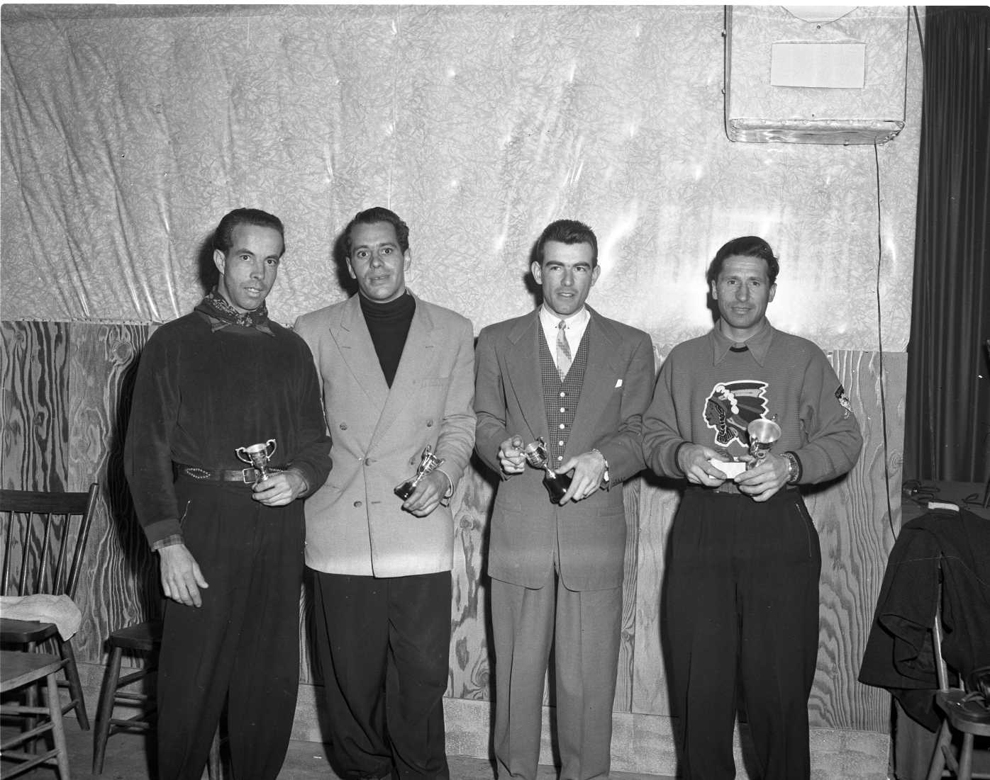 Four of the five trophy winners at the spring invitation jump meet at the Midland Ski Club Sunday are seen in this photo. Bob Staubhaar, Midland, winner of the class “C” division; Eric Kurrie, Midland, third in the main event; Rheal Seguin, Ottawa, runner up and Frank Elsigan, Buffalo, the big winner. Hubert Shaunig, Midland, runner up in the “C” class was absent.