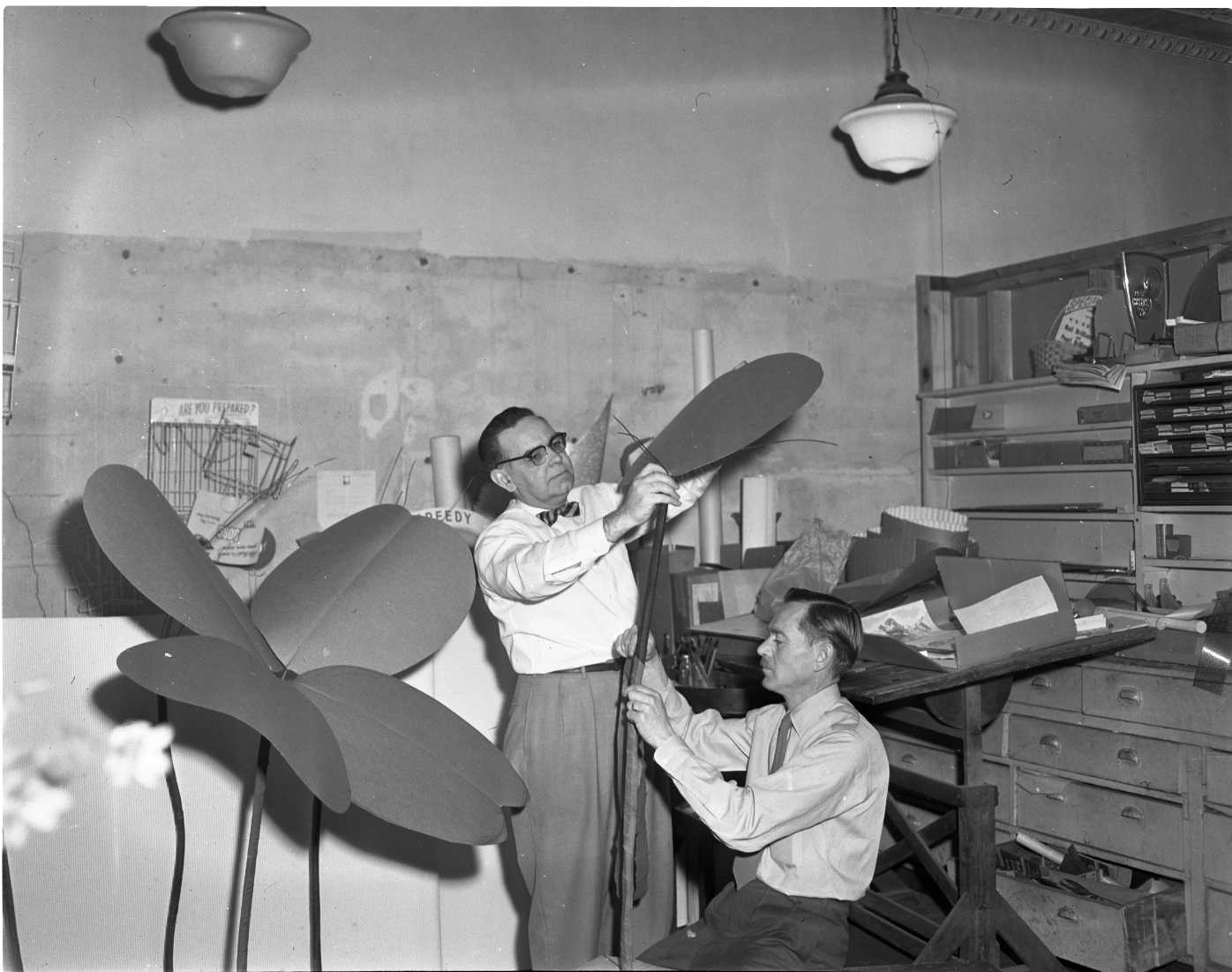 Midland merchants, Walter Woods and Web Struthers, take time from their business to create sets for the Midland Figure Skating Club’s annual carnival, sponsored by the Midland Lion’s Club.