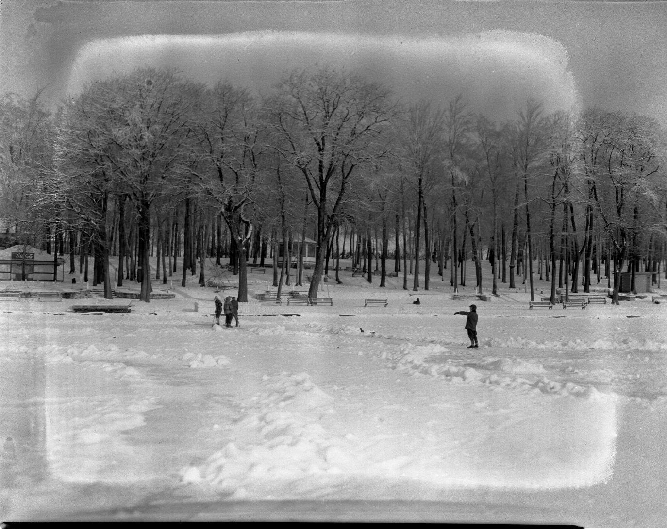 Little Lake Park in the winter prior to 1956. The log cabin was a gift from Dr. Garnet Tanner and was used as a post office for the campers. It was removed in the spring of 1956. The second photo shows the old store, also prior to 1956 and the band shell. The third, taken at the west end of the park, shows the small cabins that ended up in back yards all over the area.
