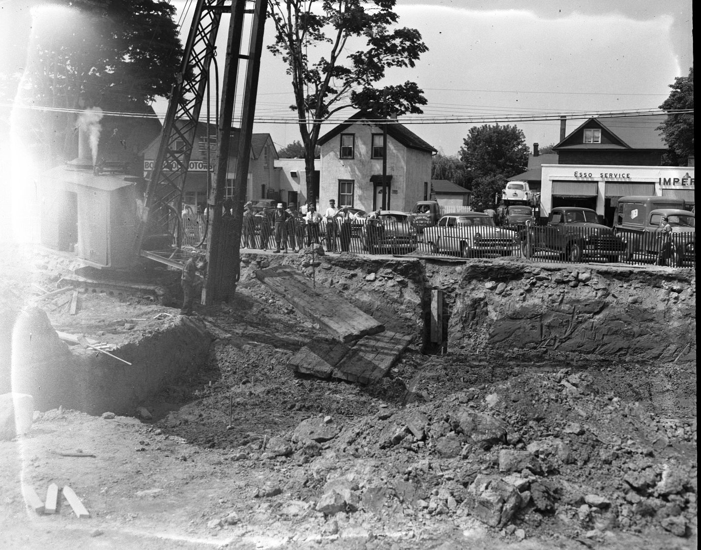 August 1955. Sidewalk superintendents keep a close watch as the first piles are driven for the new Bell Telephone exchange and office building at Midland and Hugel Avenues. It was an added step when it was discovered that the ground was wet and unstable. The machine is placing large wooden timber mats upon which it traverses the wet ground. This was the site of the former Midland Woolen Mill. Bourgeois Motors can be seen in the background.