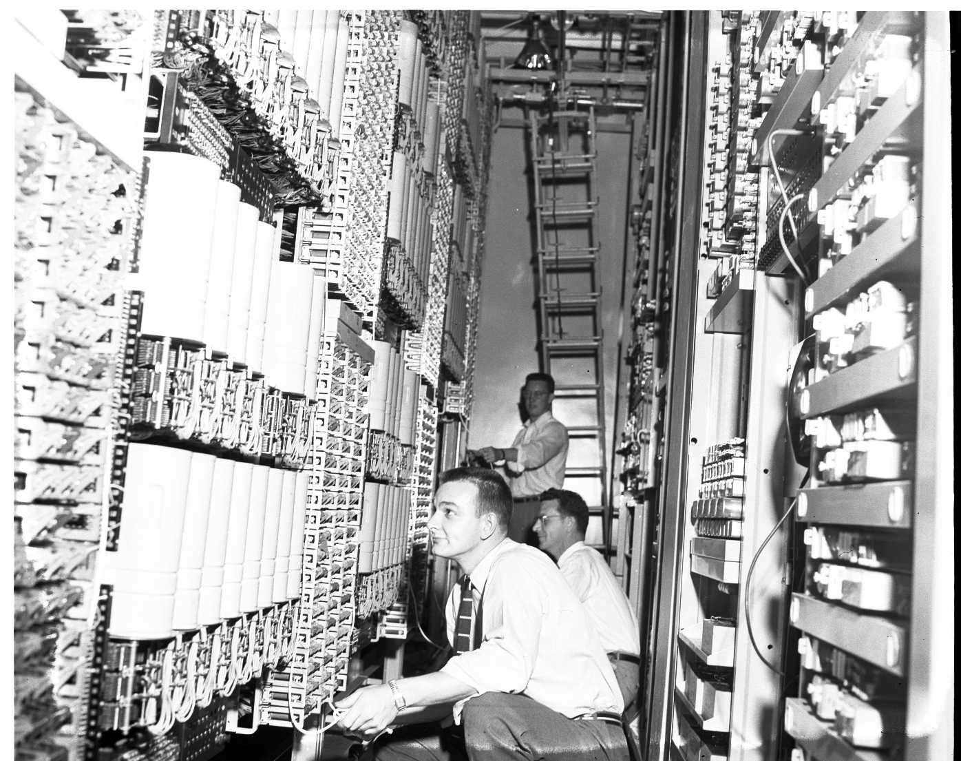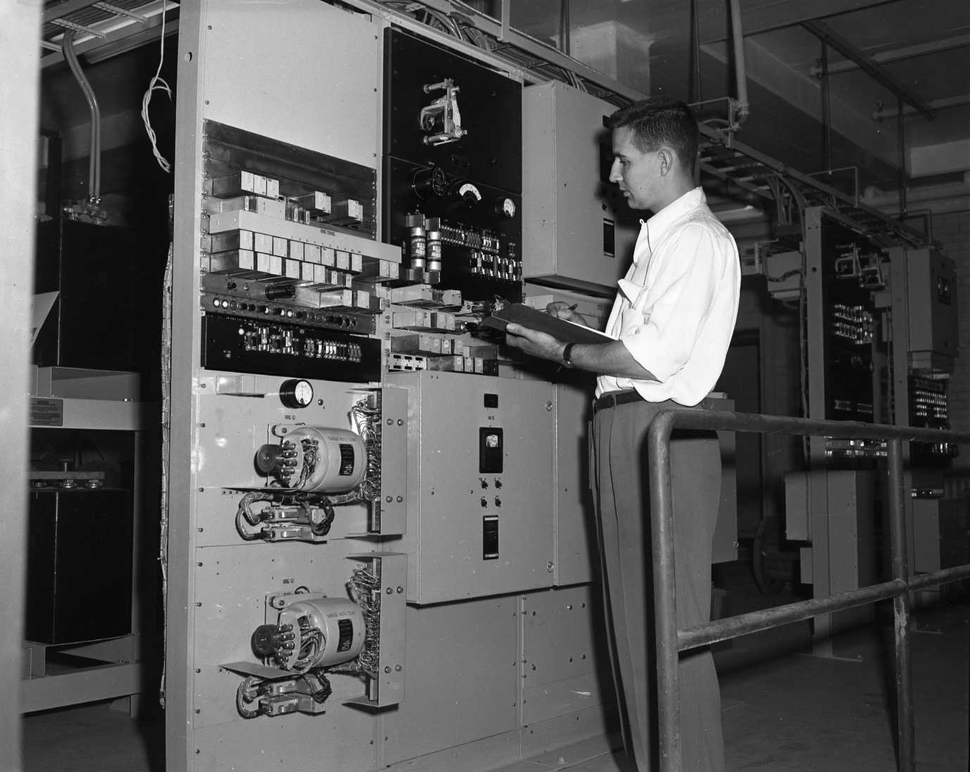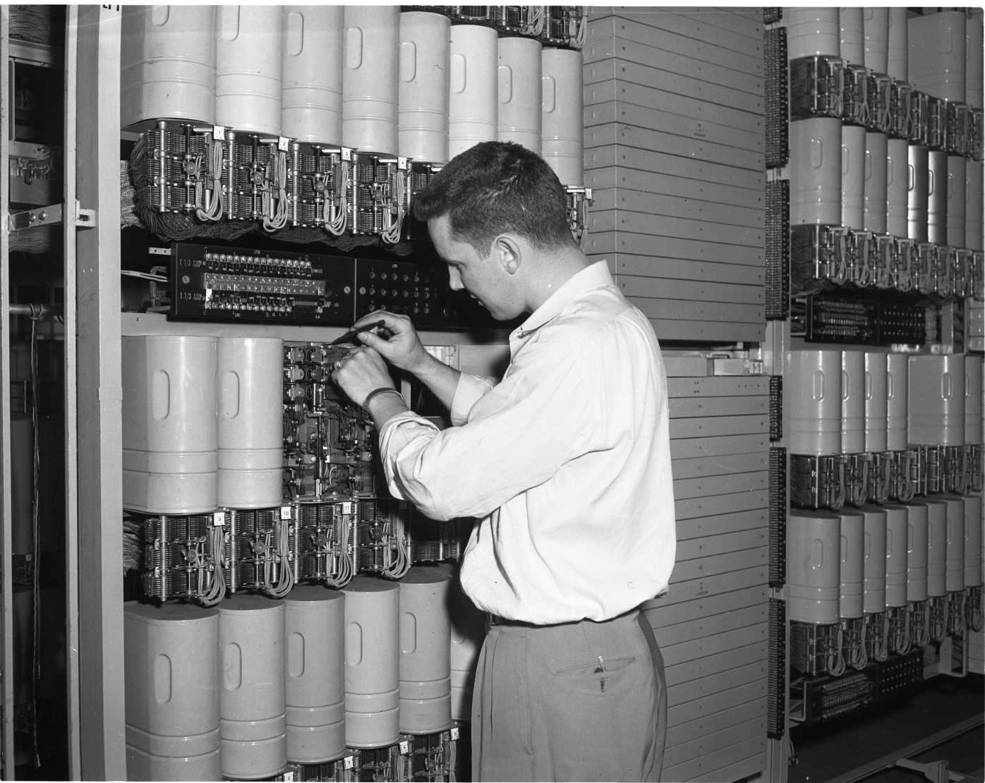 Claude Kimball, Bell technician, checks the operation of some of the switches at the new Midland exchange. Normally the switches are covered with metal canisters to protect them from dust and dirt. The floors of this room are never swept, only wet mopped to prevent dust in the air and the room is air conditioned.