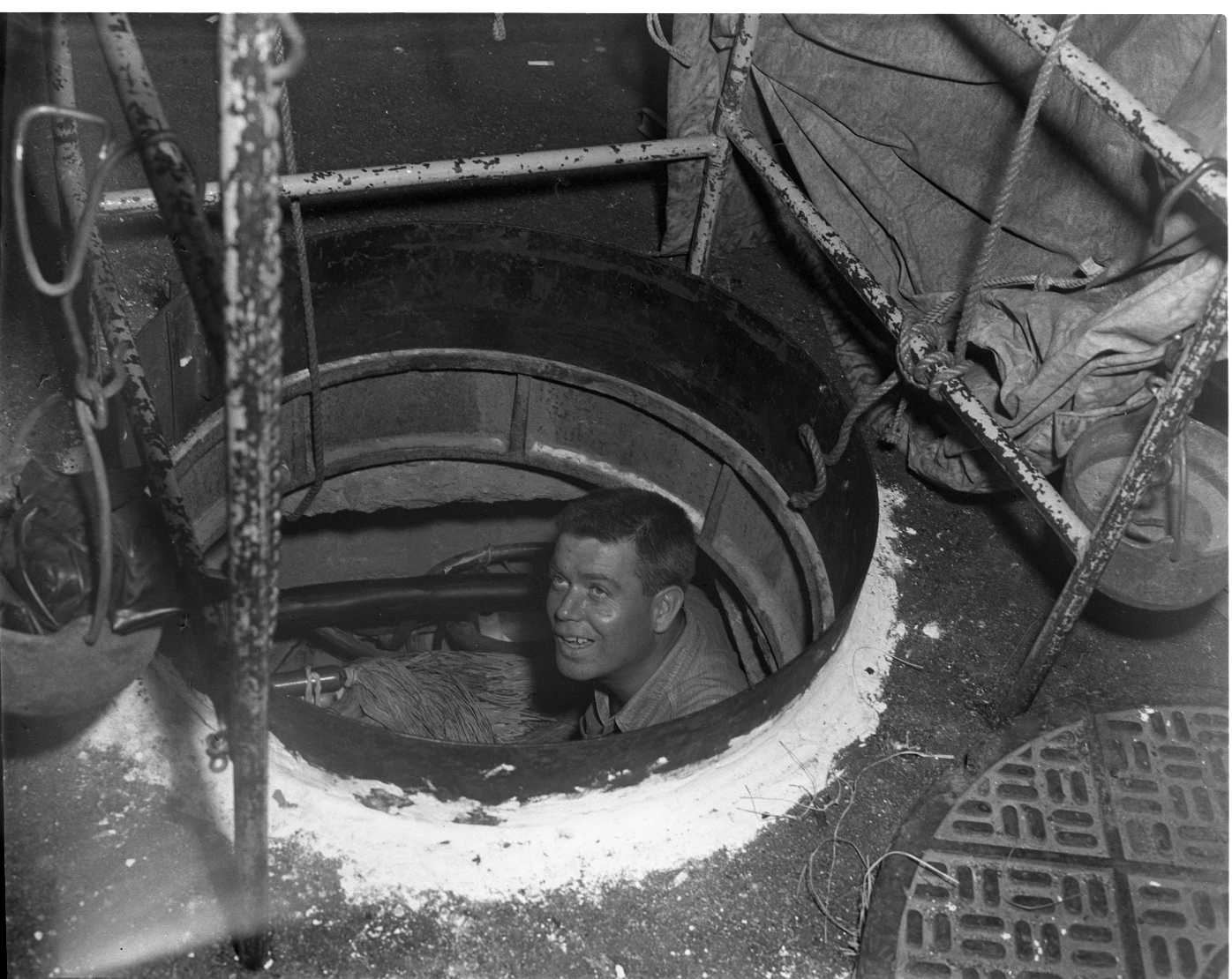 Part of the change over was the splicing of every phone line in Midland to the huge cables leading into the new dial exchange building on Hugel Ave. Stan Gilchrist, Bell splicer, is seen in at work splicing wires in a man hole on King Street.
