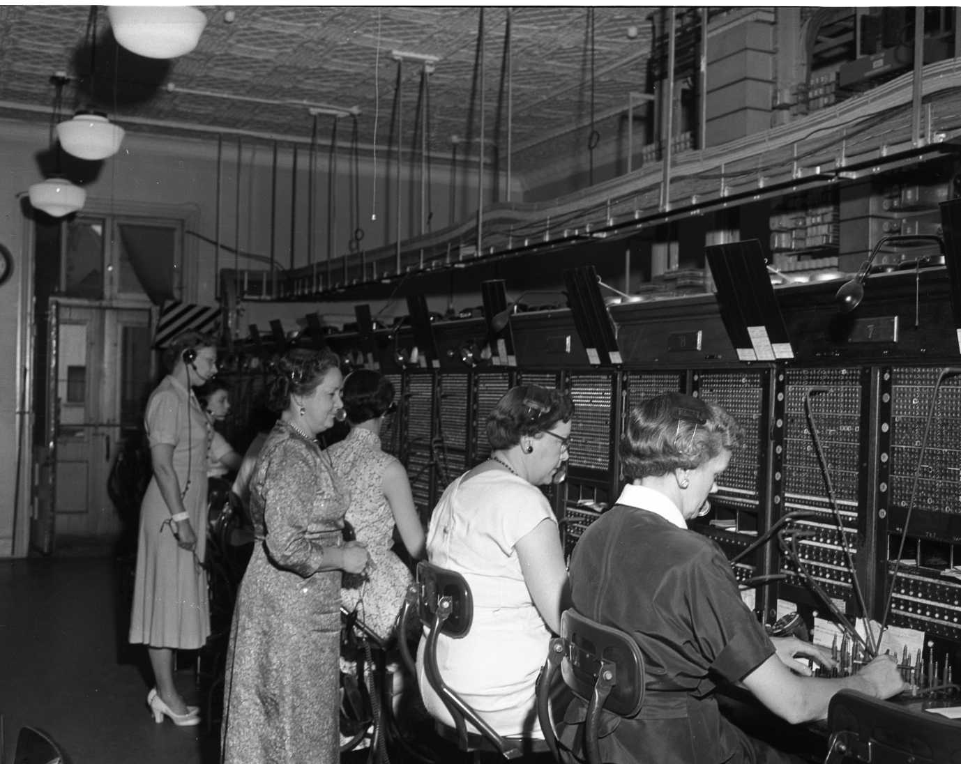 It took just 35 seconds early Sunday morning for Bell Telephone technicians to take Midland’s manual system out of operation and put more than 3,000 telephones on dial service. When the exchange “went to dial” all telephone numbers were simultaneously changed to the new “LAkeside6” (526) designation. Shortly before 3 A.M. Sunday morning operators asked customers using their phones to hang up and reconnect in two minutes using the dial. At the command “pull coils” a group of Bell employees standing behind the old main frame pulled on cords attached to hundreds of fuses, two for each line, littering the floor in seconds. With the fuses removed the old common battery switchboards were dead. Using a special phone line word was passed to the new exchange building to activate the dial equipment. Another group of men, stationed in front of the rows of switching equipment, pulled on cords attached to hundreds of blocking tools, little plastic insulators which were keeping the dial equipment from functioning. Direct dial had come to Midland.