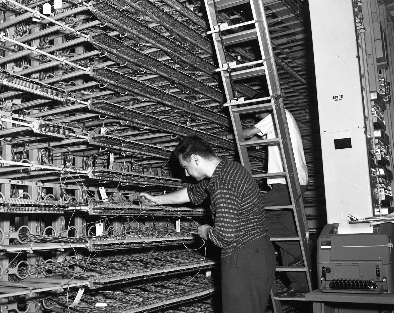 Eric Renkl, skilled Northern Electric employee is seen at work on the main distributing frame in the new Midland dial telephone exchange building. The frame provides the link between the cables serving the town and the dial switching equipment. Each pair of wires among the thousands leading from the cables must be matched with the corresponding pair leading to the dial switches and soldered together.