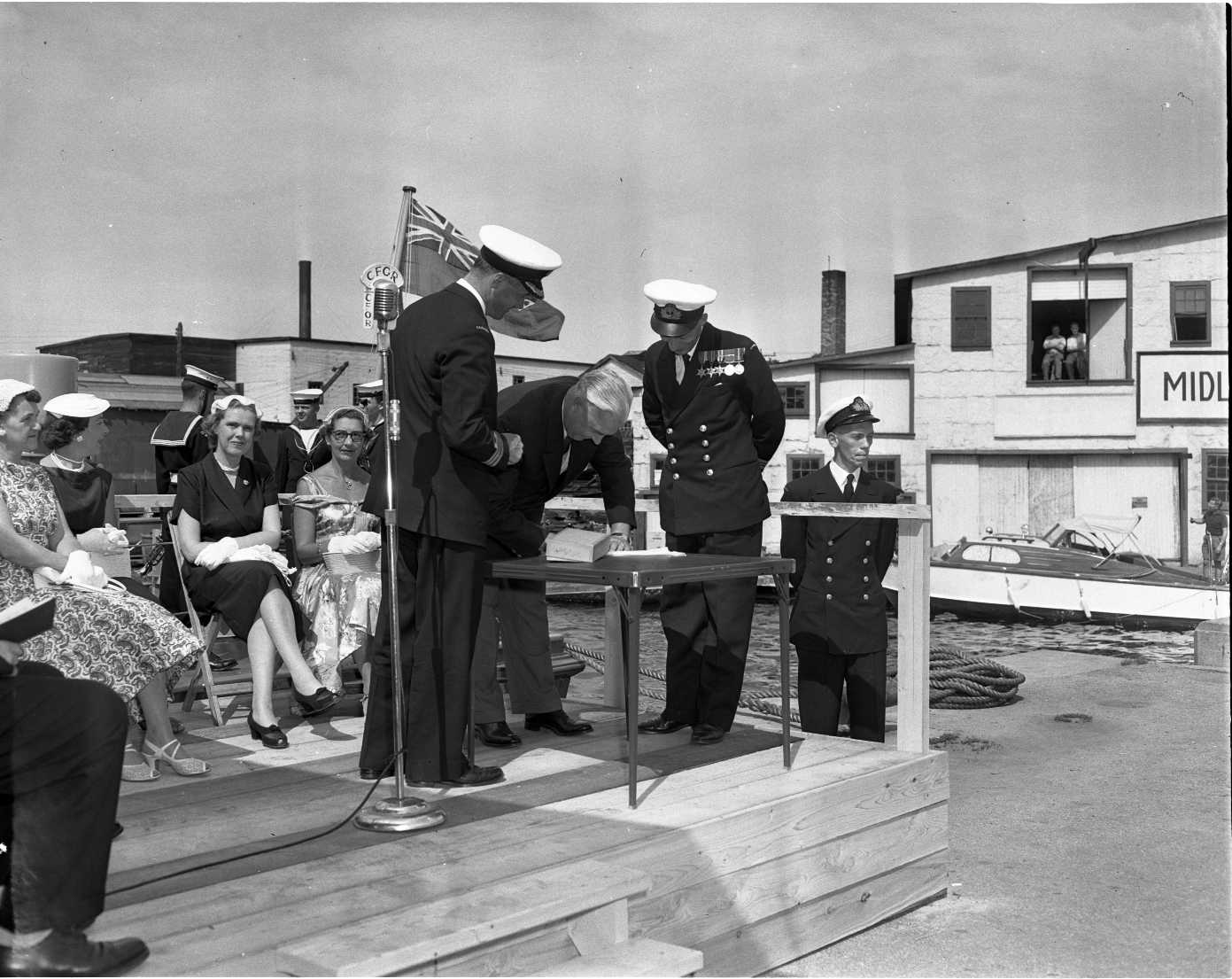 Midland Boat Works president T. M. McCullough signs the navy acceptance form during commissioning ceremonies for the HMCS Cormorant at Midland town dock Monday. The ship’s sponsor Mrs. Murray Wagg can be seen to the left of the microphone stand. Commander Henning, representing naval headquarters, and Lt. Cmd. C. R. Manfield, commanding officer, watch the signing. At right is S/Lt. Don C. Young.