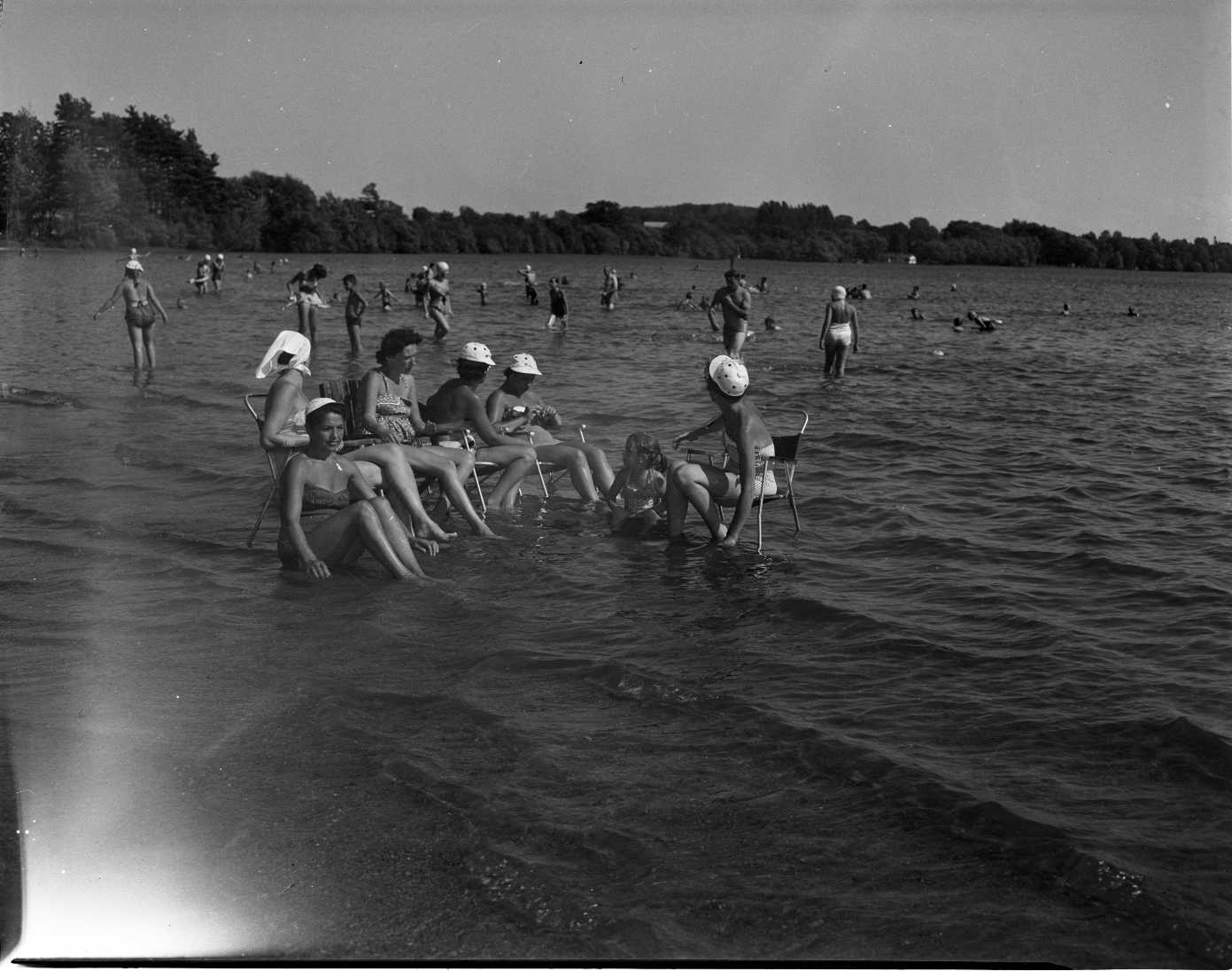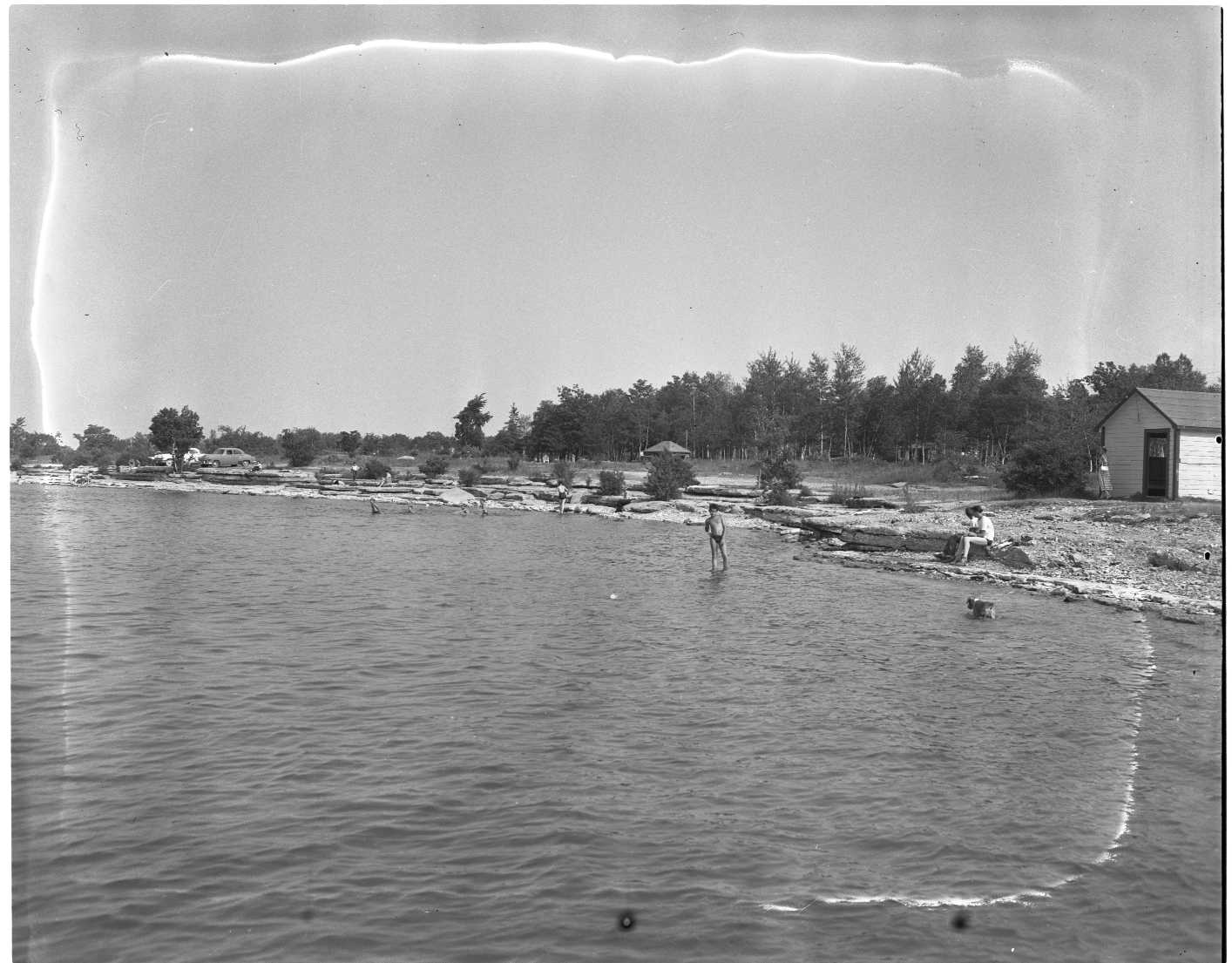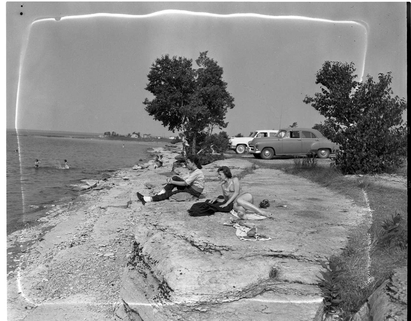 Rugged shoreline of flat limestone rocks is preferred by many cottagers and visitors who come to Port McNicoll’s Paradise Point. The rock extends only a few feet into the water before giving way to a fine sand bottom. Enjoying the sun are Mrs. W. A. McLeod, Toronto, in the foreground, and Judy Parliament of Port McNicoll.