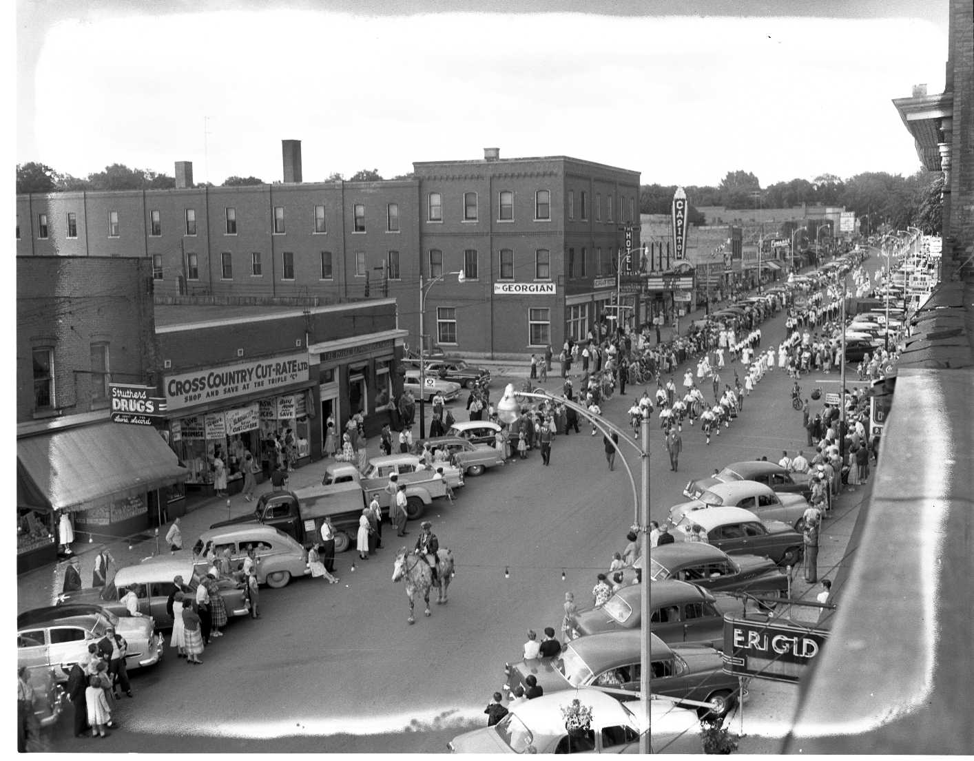 Parade on King Street, band being led by majorettes in conjunction with the Canadian Bandmasters Association convention being held in Midland.