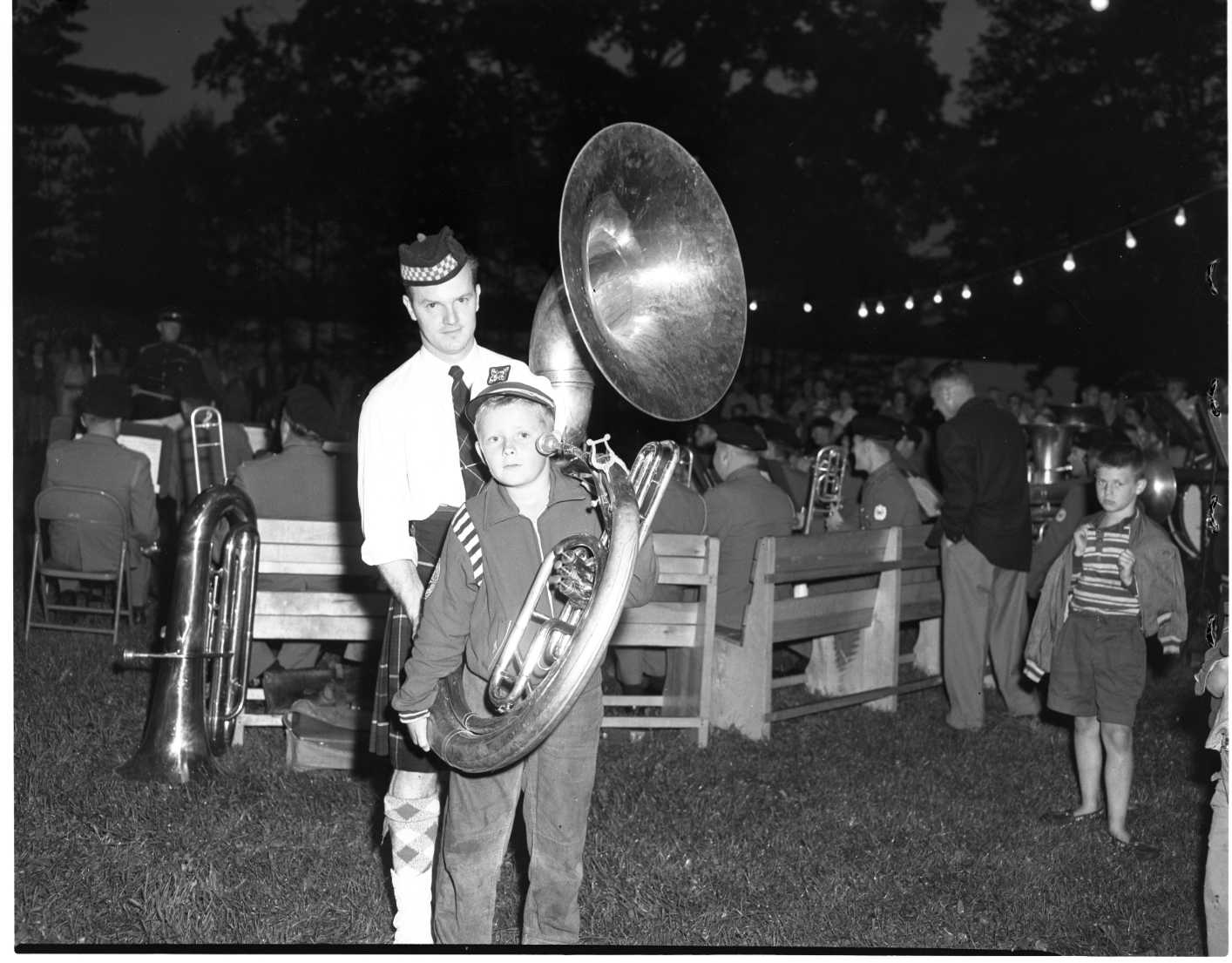 Allan Rees, 9, of Brantford, doesn’t think he will take up the tuba right away. He is helped by Al Reid who plays for the Orillia Kiltie Band and is here for the concert in the park in connection to the Canadian Bandmasters Association convention being held at the Parkside Inn.