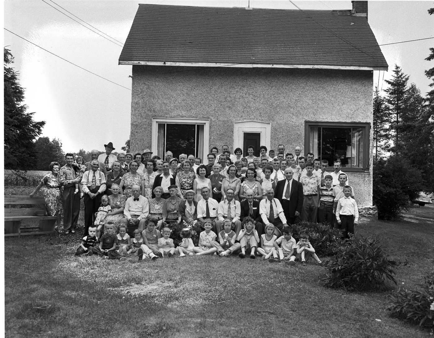 At the Downer family reunion in Tiny Township on July 21st, Rev. A. W. Downer of Duntroon, MLA for Dufferin – Simcoe is surrounded by children. Midland alderman Ossie Downer is also in the picture and is host of the event this year at his home on “The Mountain” west of Midland. All are descendants of two brothers, William and Henry Downer, who came to Canada from County Cavan, Ireland in 1842. The original Downer’s settled near Peterborough but most of Henry’s descendants were born in Tiny Twp.