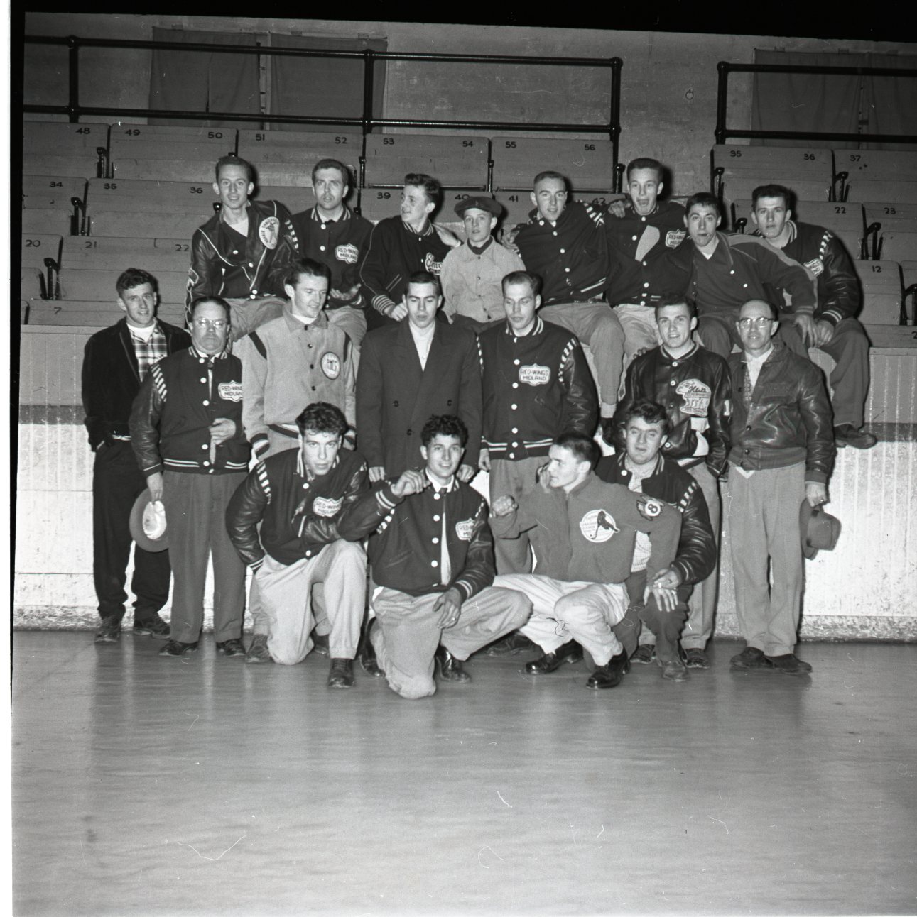 April 1954. Midland Red Wings hockey team pictured on the ice at the Midland Arena Gardens. Back home at 4:00 AM after winning the Junior “C” Championship in Ingersoll Friday night. Back row, Jack Reid, Ken Webb, Homer Barrett, stick boy Barry Crawford, Murray Yorke, Jack Hendrickson, Ken Simms, Stan Ritchie, Middle row, Larry Reid, secretary Cliff Newburn, Bruce Calvert, Gerry Gerow, Bud Quinn, Don Hudson and Charlie York, kneeling; Mike Belejac team captain, Johnny Lizotte, Mervin James, trainer Harold Jackson.