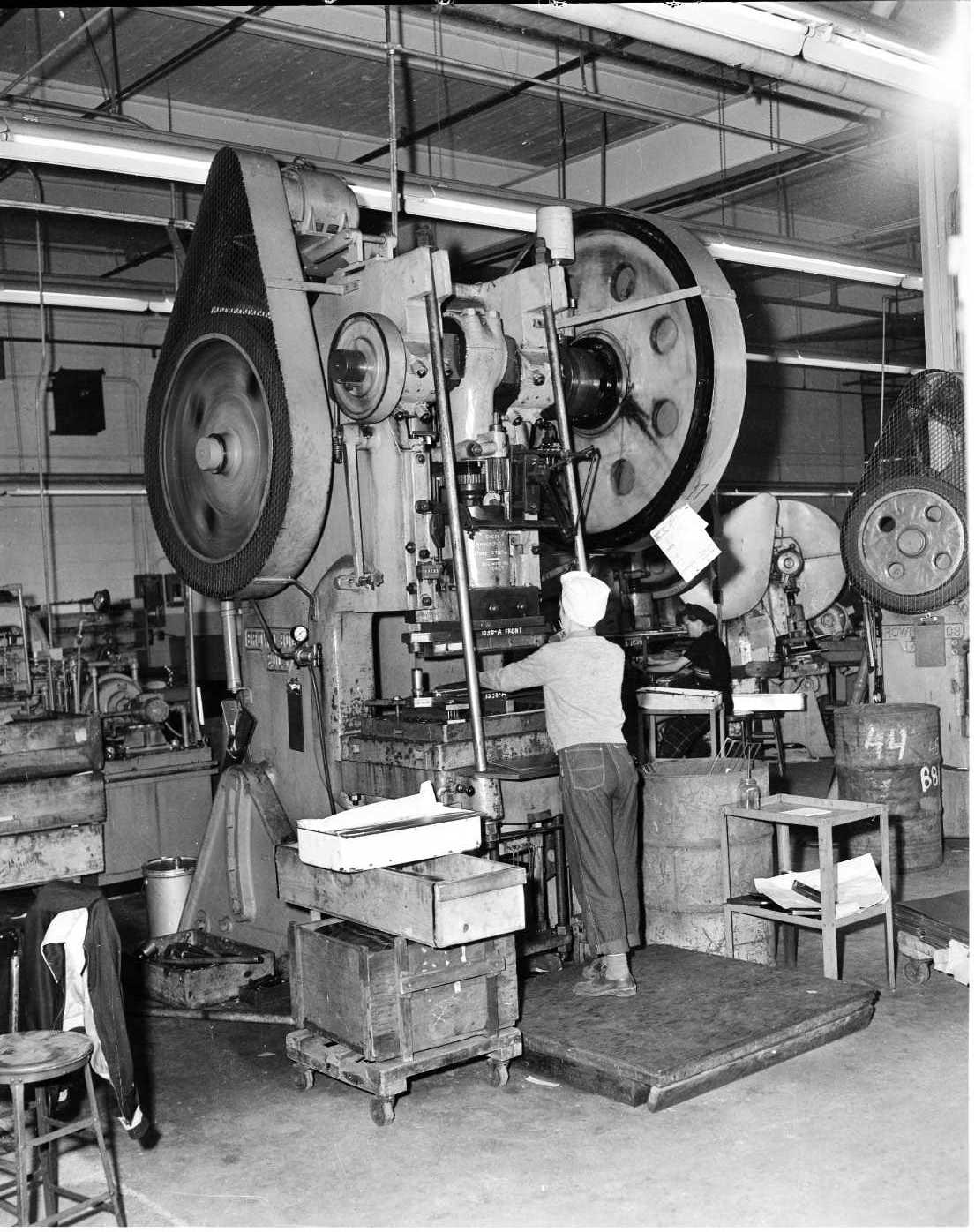 90 Ton punch press is used by Canadian Name Plate in its new Midland plant for blanking and forming stove and refrigerator panels and trim. Operated by one of the many female employees at the plant.